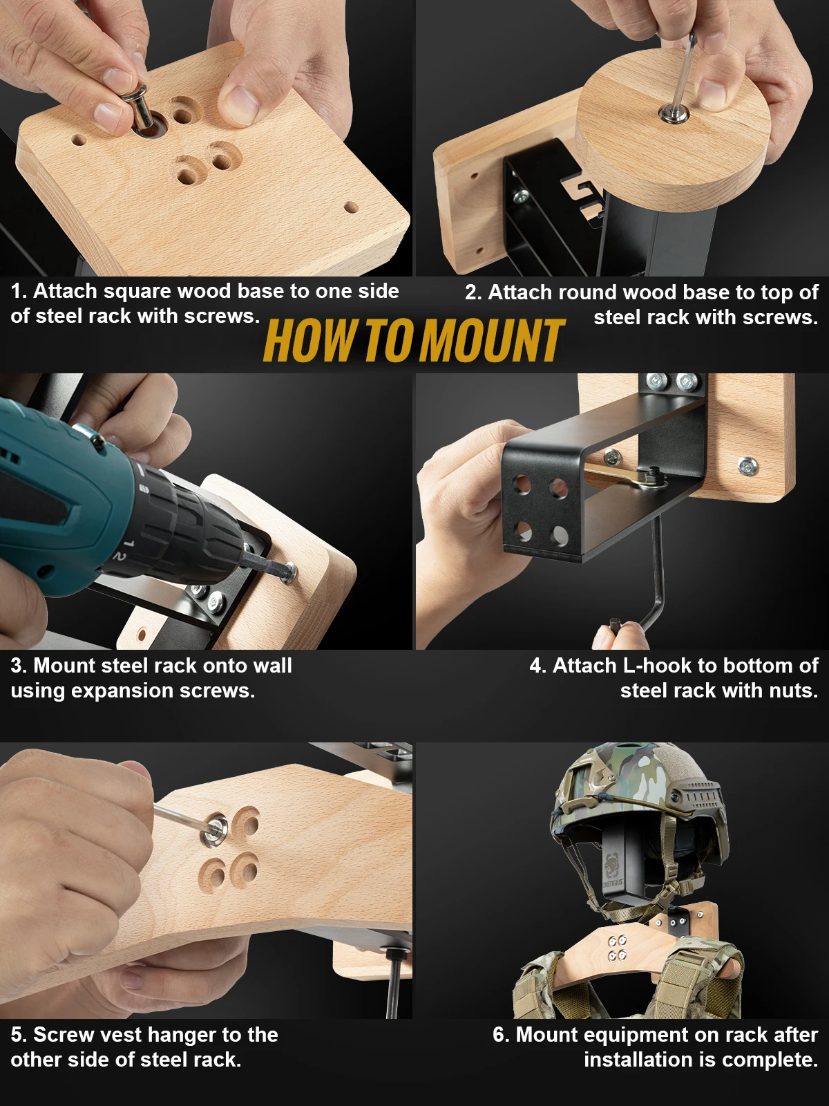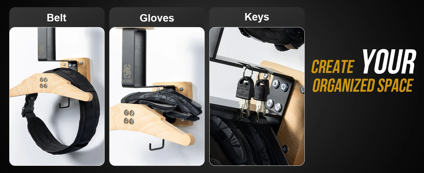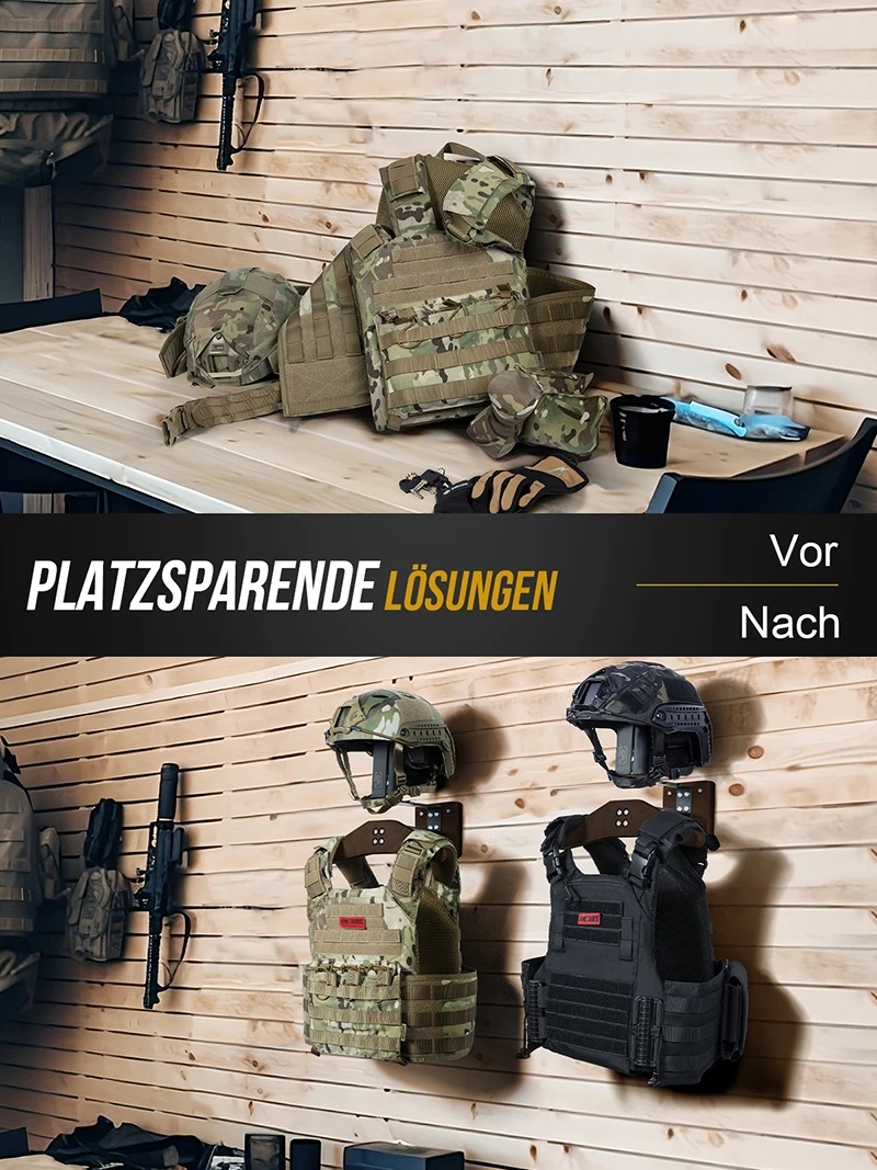 Almacenamiento versátil de equipos: este estante para montaje en pared es perfecto para almacenar una variedad de equipos, incluidos equipos tácticos como cascos, chalecos, cinturones, guantes y equipos de ciclismo como cascos, camisetas, guantes y llaves.Incluso puede acomodar equipos de fútbol o esquí, como cascos y ropa, lo que la convierte en una solución de almacenamiento versátil para todo su equipo.