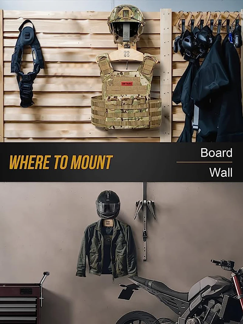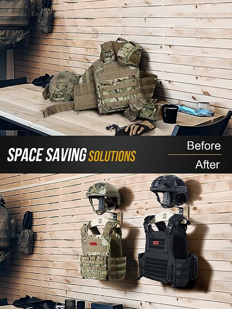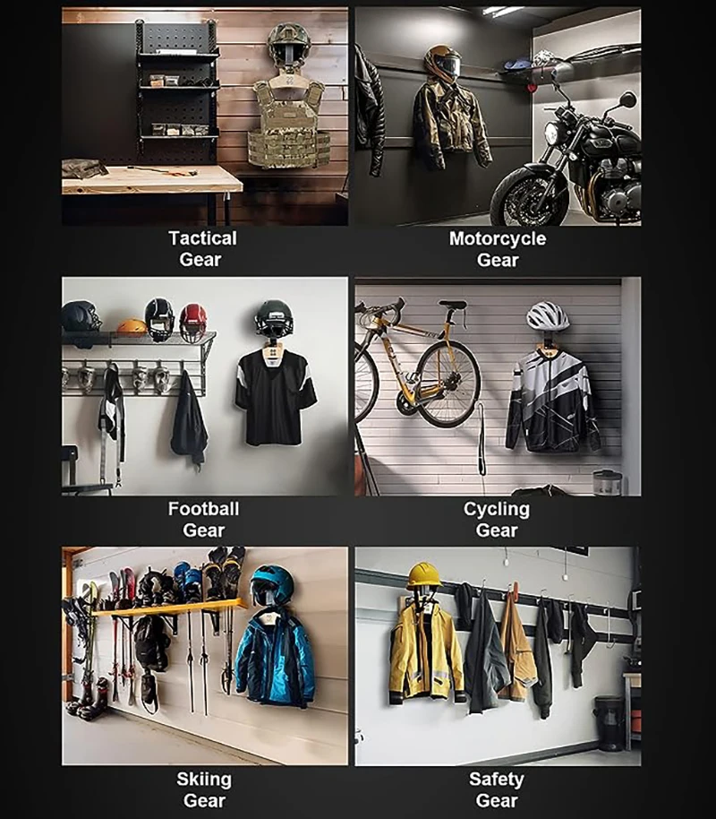 Almacenamiento de equipos versátil: Este estante de montaje en pared es perfecto para almacenar una variedad de equipos, incluidos equipos tácticos como cascos, chalecos, cinturones, guantes y equipos de ciclismo como cascos, camisetas, guantes y llaves. Incluso puede acomodar equipos de fútbol o esquí, como cascos y ropa, lo que lo convierte en una solución de almacenamiento versátil para todo su equipo.