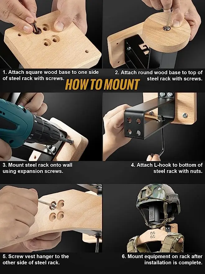Instalación fácil y sin complicaciones: Este estante de equipo táctico se puede instalar fácilmente en paredes o tablas de madera, y viene con un manual correspondiente para guiarlo a través del proceso de instalación. No tendrá que preocuparse por procedimientos de instalación complicados o por contratar a un profesional para que lo instale por usted.