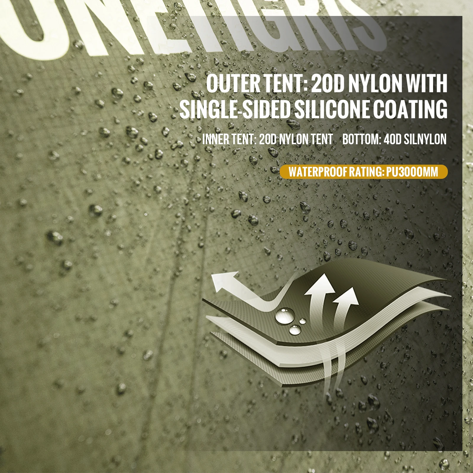 Ligera y duradera: la tienda de campaña OneTigris STELLA cuenta con una tela exterior de nailon 20D liviana y duradera con un revestimiento de silicona de una sola capa, lo que la hace resistente.Adecuado para mochileros, artesanos, campistas cotidianos y familias.