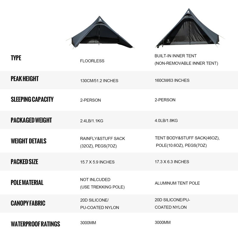 Tienda de malla interior: los campistas pueden elegir entre la opción sin malla de 4,2 pies de alto y la opción interior de malla integrada de 5,2 pies de alto. Sabemos que algunos de ustedes prefieren la sensación real de tipi sin suelo, y otros necesitan esa barrera de malla para mantener alejados a los insectos.