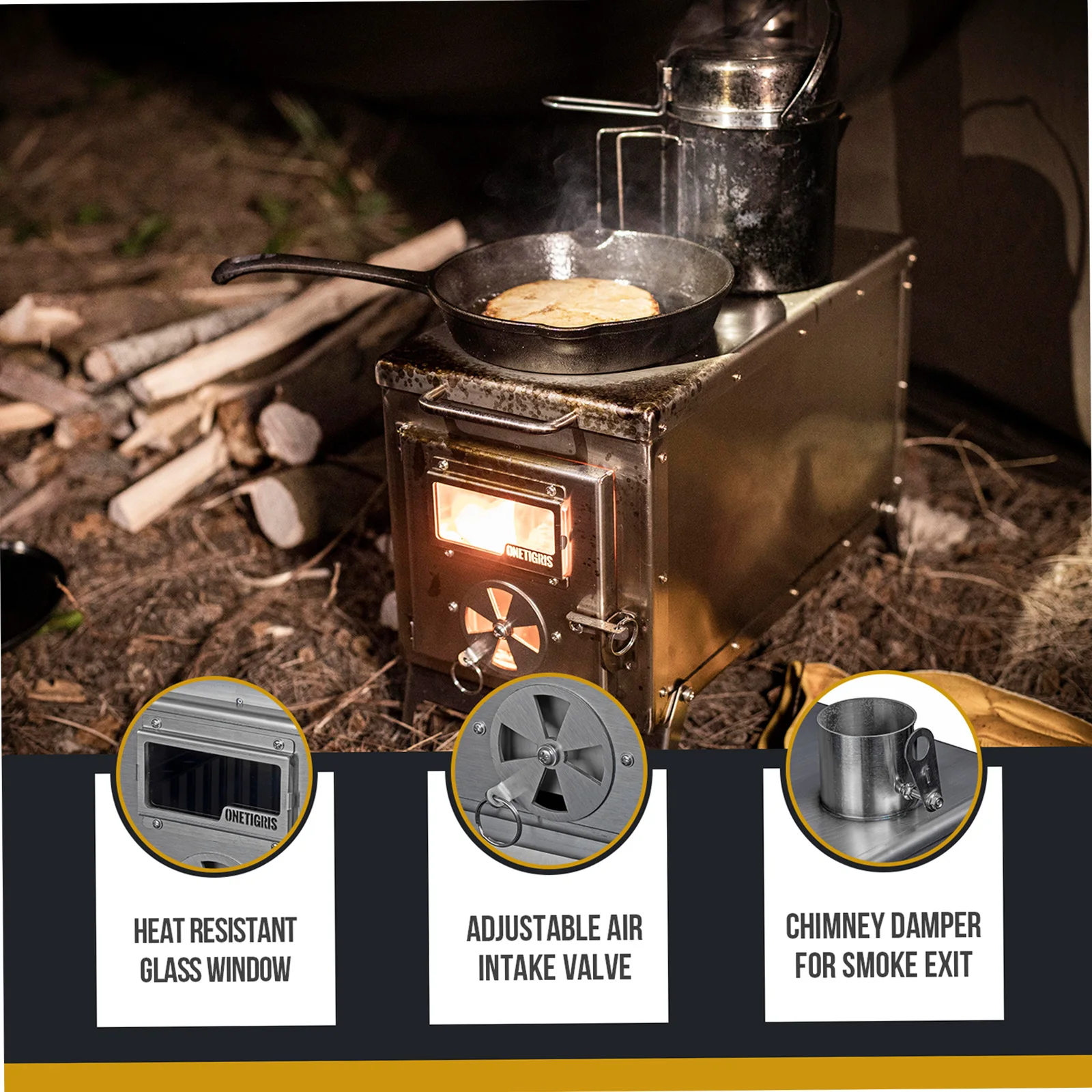 Tercero en línea de nuestras estufas de camping ROC, esta es la más grande de todas ellas.Con cuerpo de estufa forjado de#acero inoxidable 304, eso es’Es un kit ideal para los amantes del aire libre que poseen un automóvil durante los viajes de campamento invernales y las misiones de cocina al aire libre.El sistema de estufa viene con un tubo de estufa, coderas, un par de guantes de cuero de calidad y un trozo de cristal de repuesto.Todas las piezas se pueden almacenar dentro del cuerpo de la estufa.