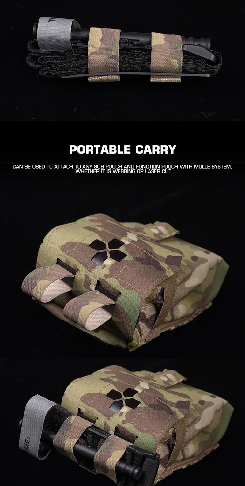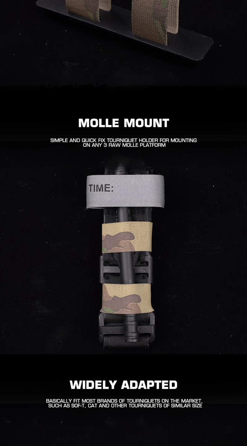 3. Sistemas Molle: el soporte de torniquete puede sujetar el torniquete a cualquier sistema MOLLE como chalecos, paneles de topos, cinturones y otros equipos. Se monta vertical u horizontalmente.