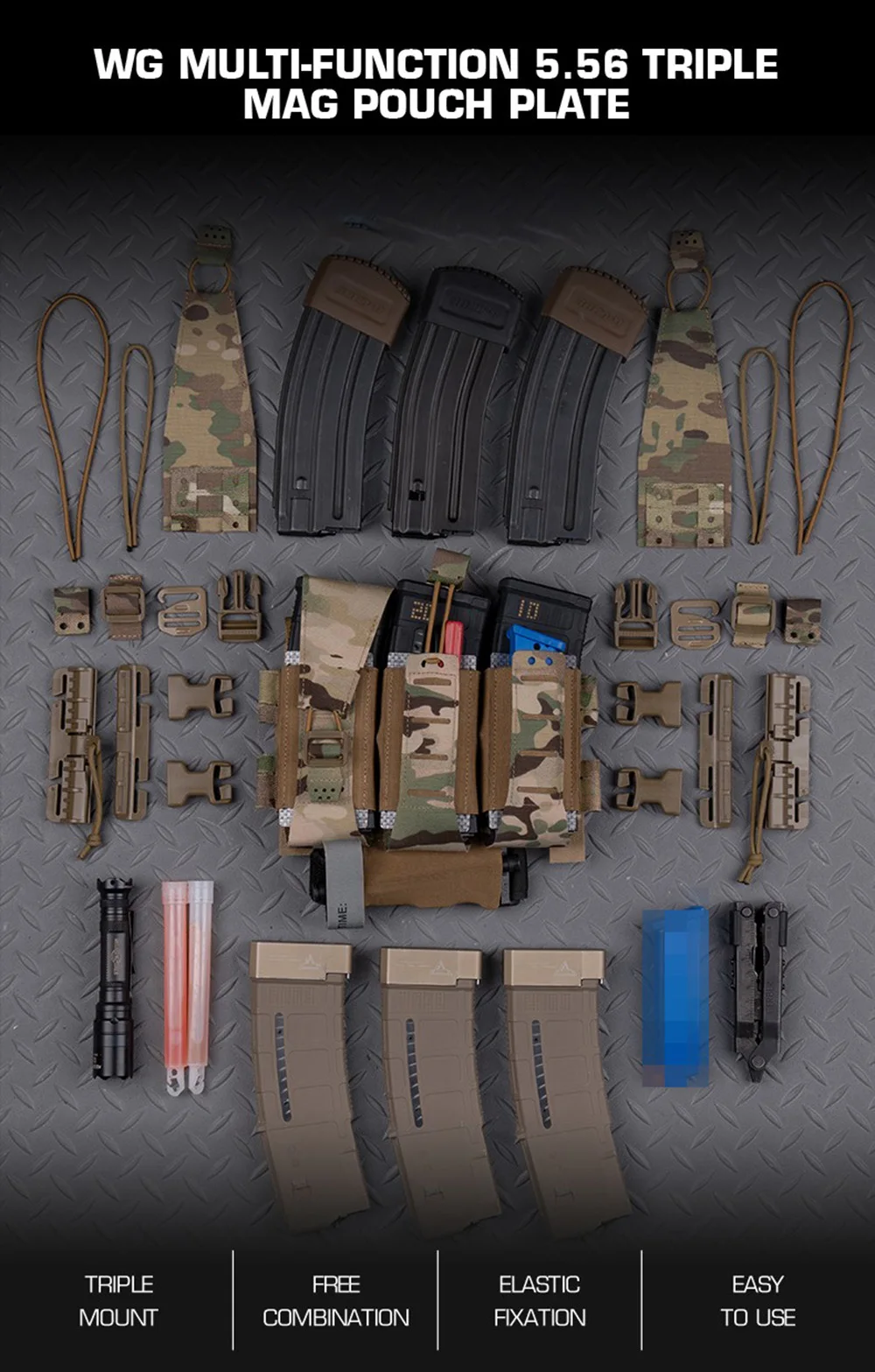 1.Cuerpo de bolsa elástico ampliamente aplicable, adecuado para varias cargadores de 5,56, se puede utilizar como bolsa de revista abierta