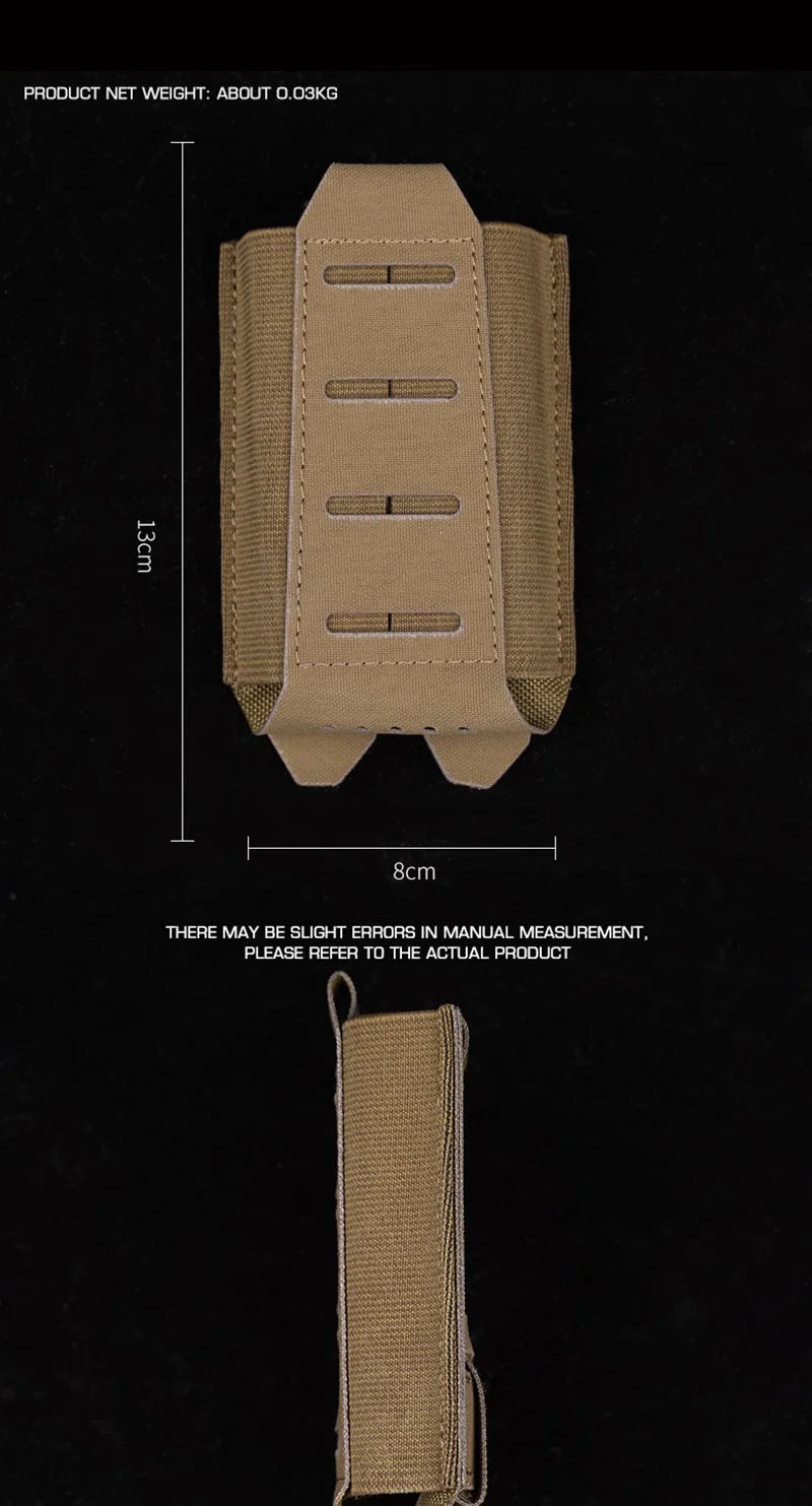 2. Soporte MOLLE, la cinta MOLLE trasera se puede instalar en un sistema MOLLE de media pulgada o 1 pulgada.
