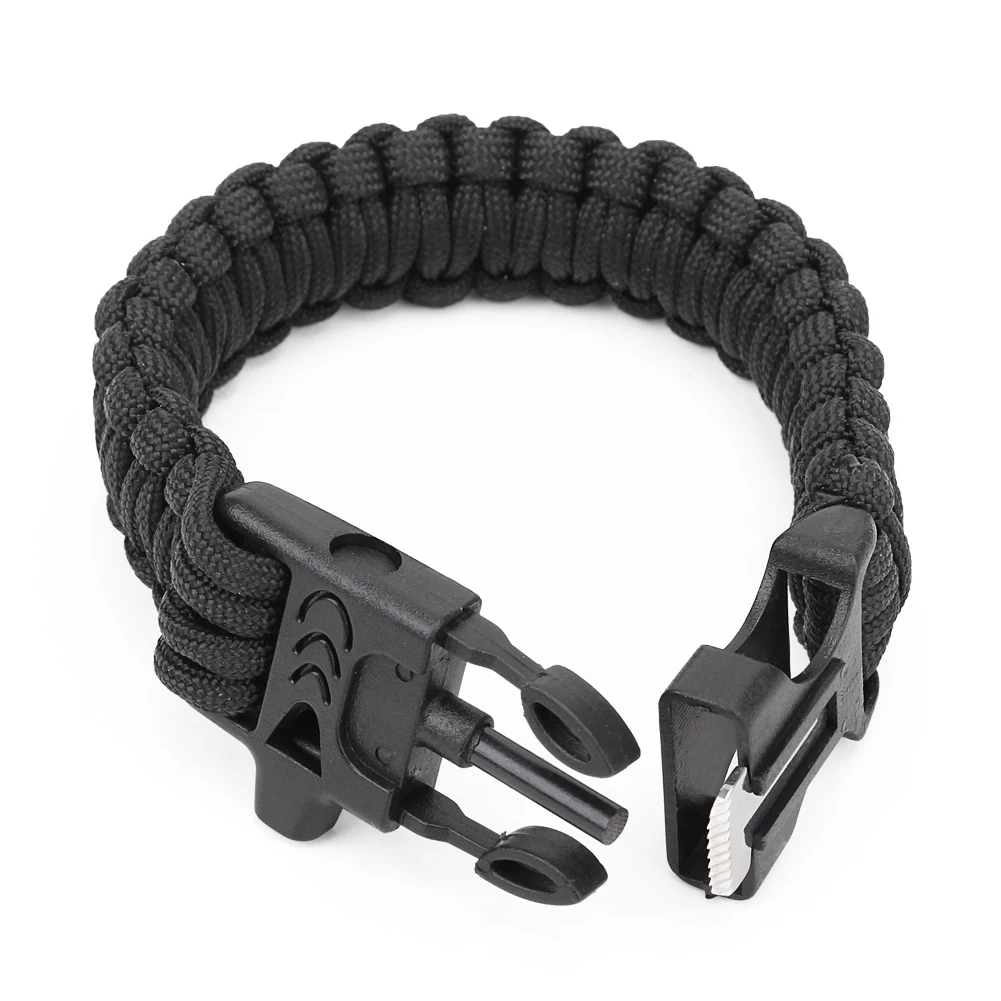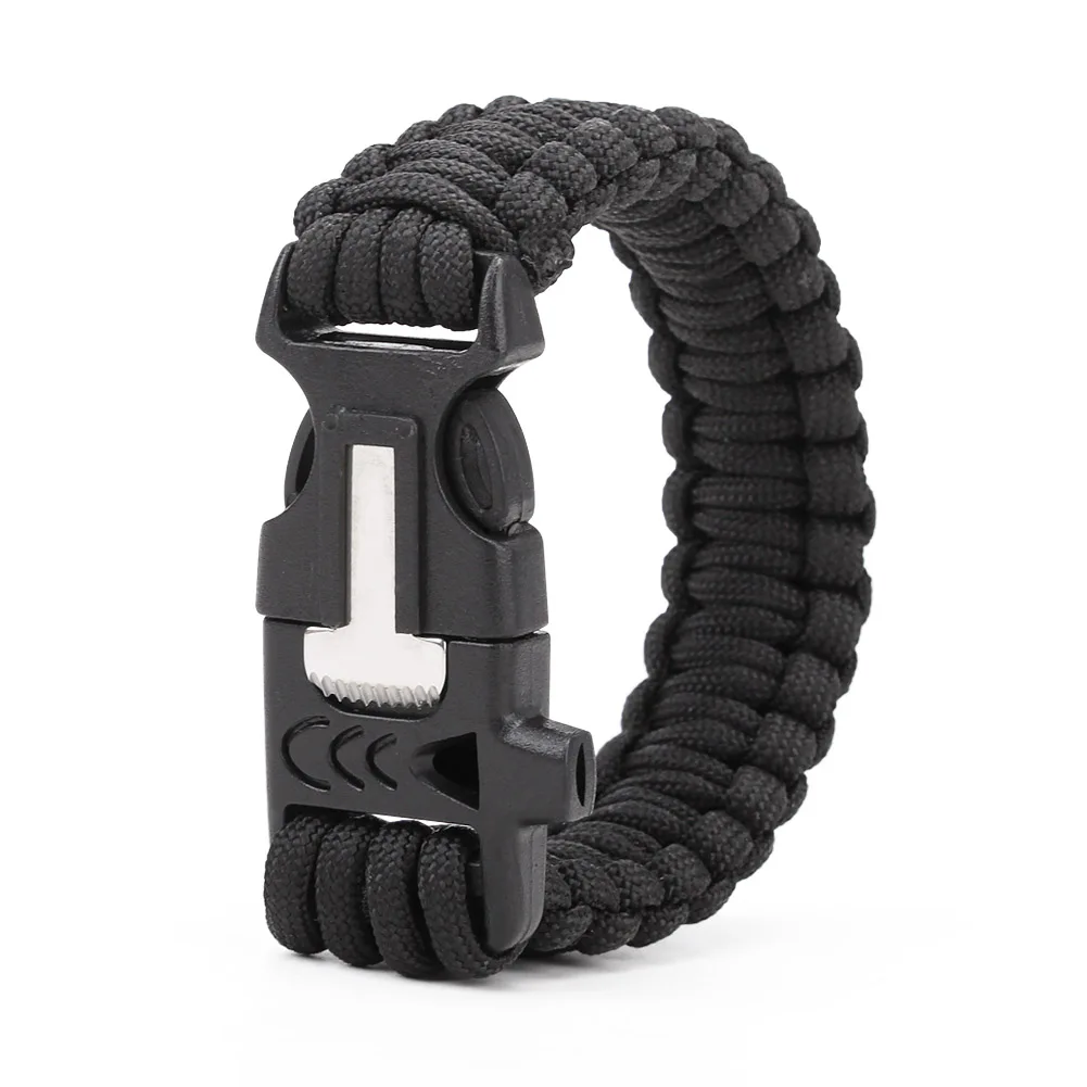 Una pulsera de supervivencia le permite llevar varios pies de cordón de paracaídas fácilmente, que puede usarse en caso de emergencia.