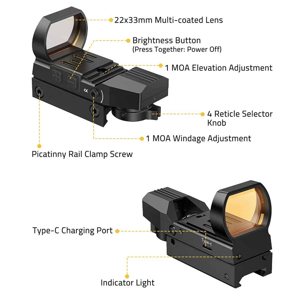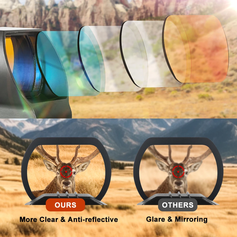 - Con lente objetivo multicapa de 22x33 mm, que proporciona una visión clara y amplia para ayudarle a localizar el objetivo fácilmente.
