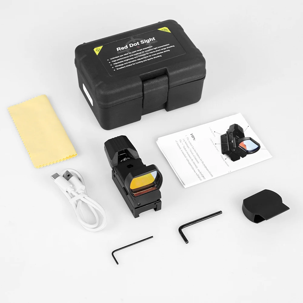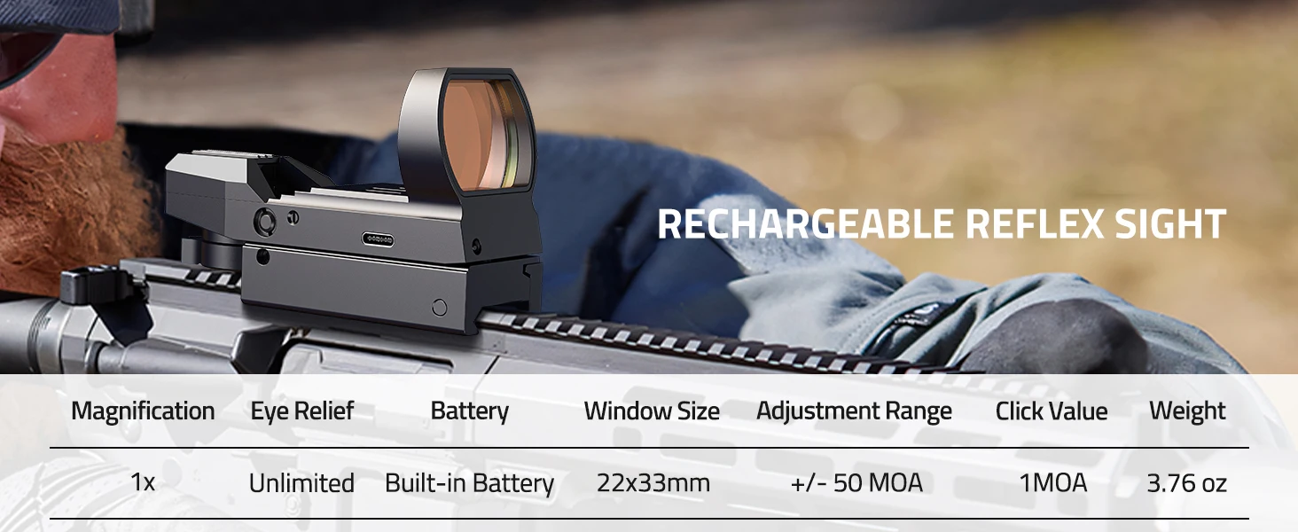 - La óptica de punto rojo se puede cargar completamente en 30 minutos y tiene una duración de batería de 240 horas.