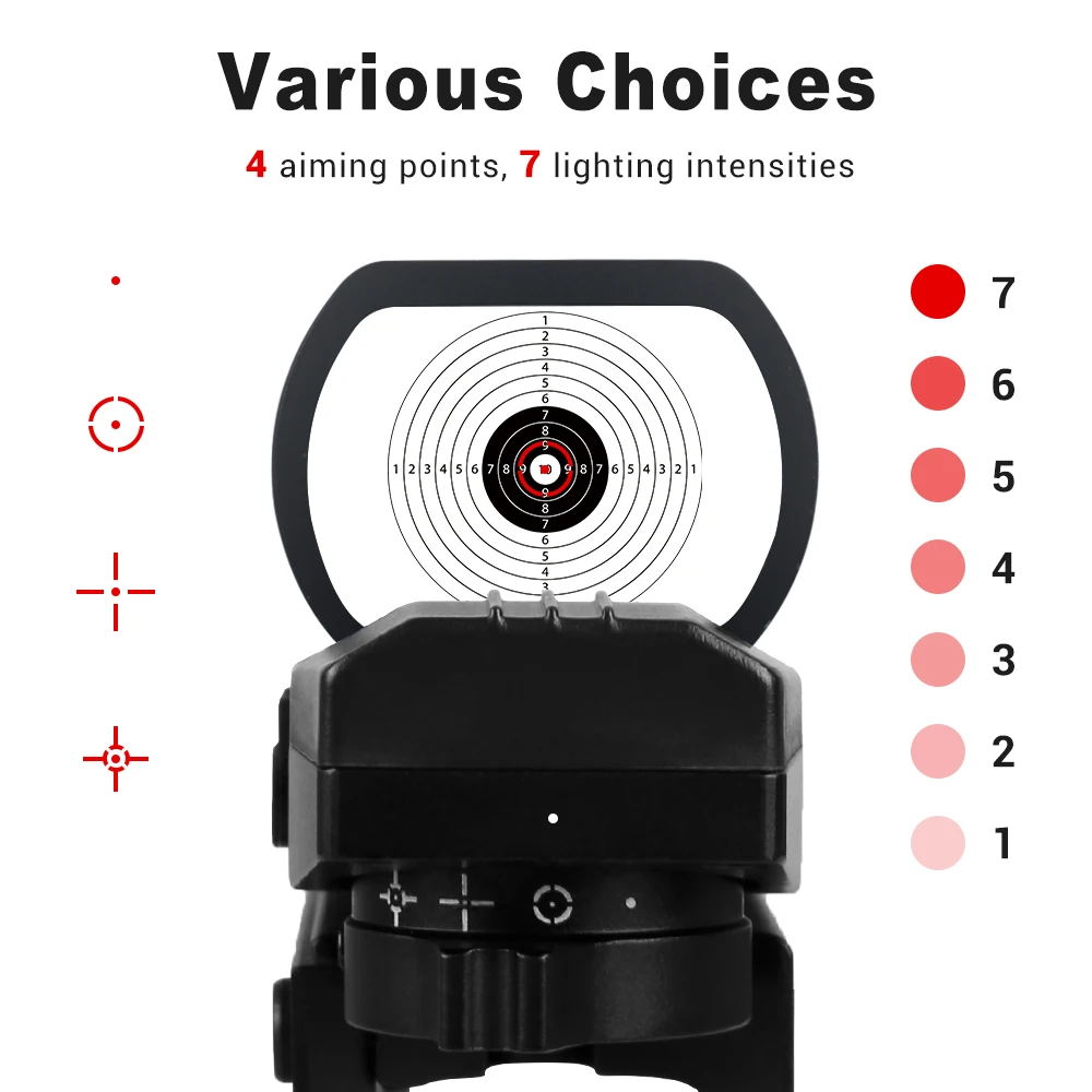 - Con 7 niveles de ajuste de brillo, la mira de punto rojo se puede ajustar para ajustar la vista desde la luz solar hasta el anochecer.