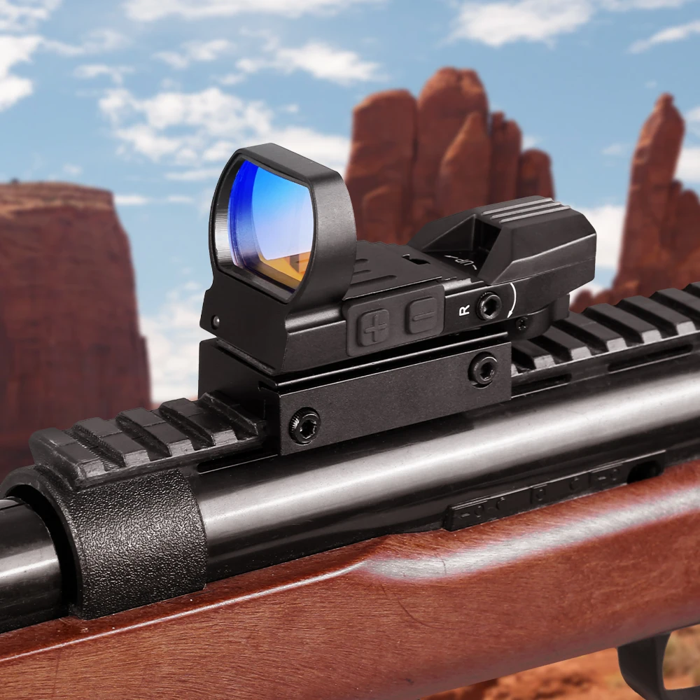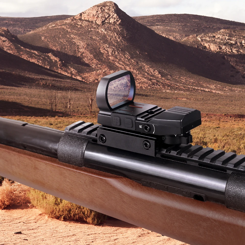 - Las miras reflejas iluminadas en rojo con 4 selecciones de retícula brindan varias opciones para satisfacer diferentes ocasiones.