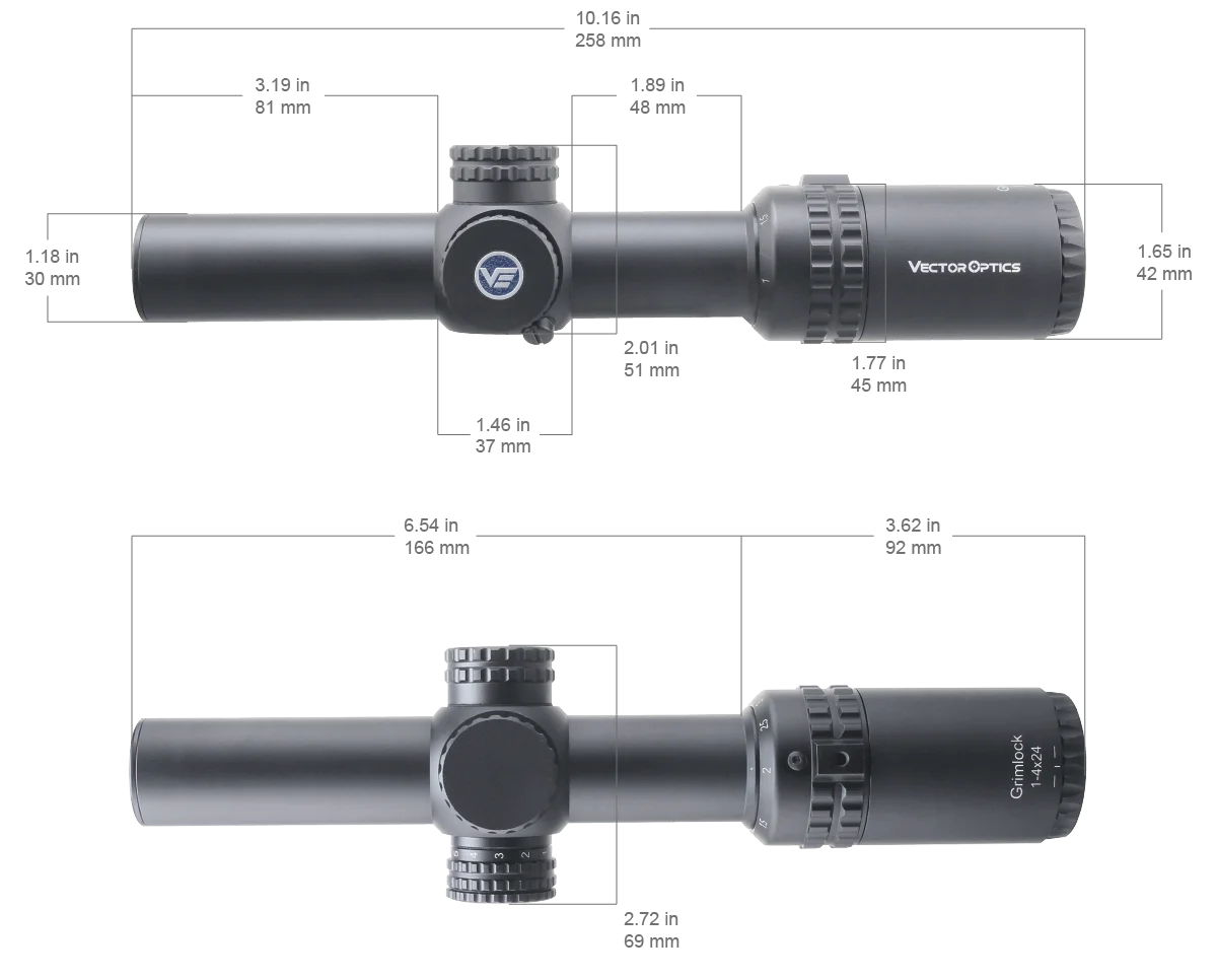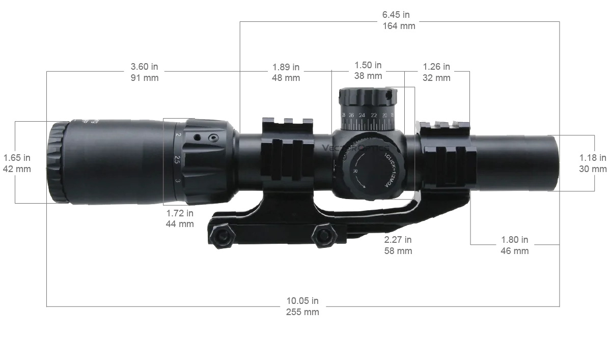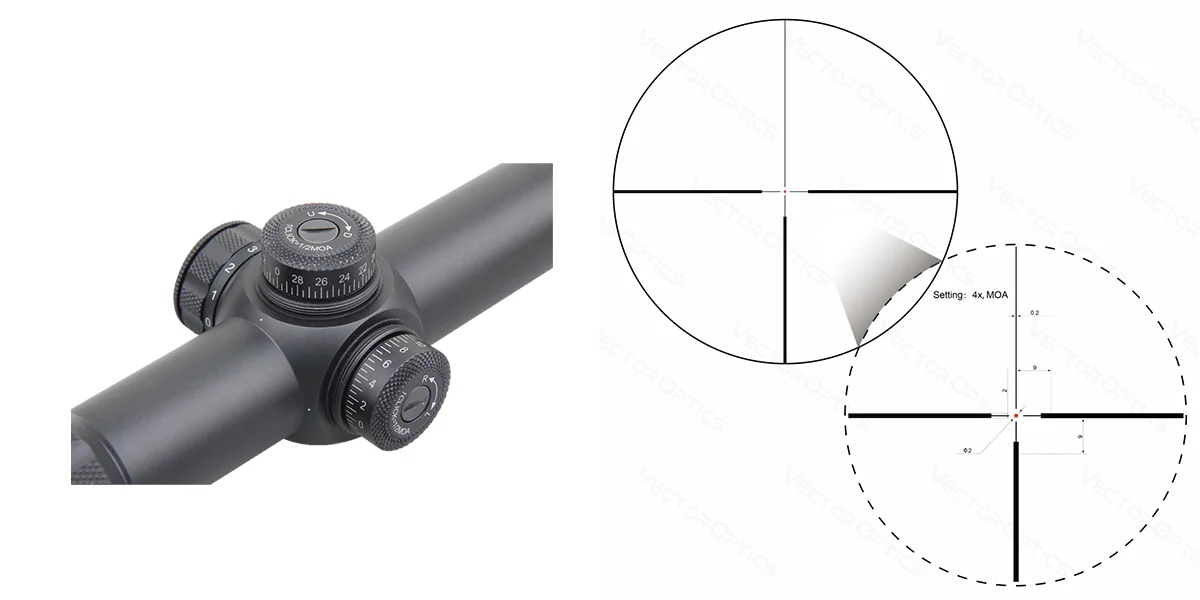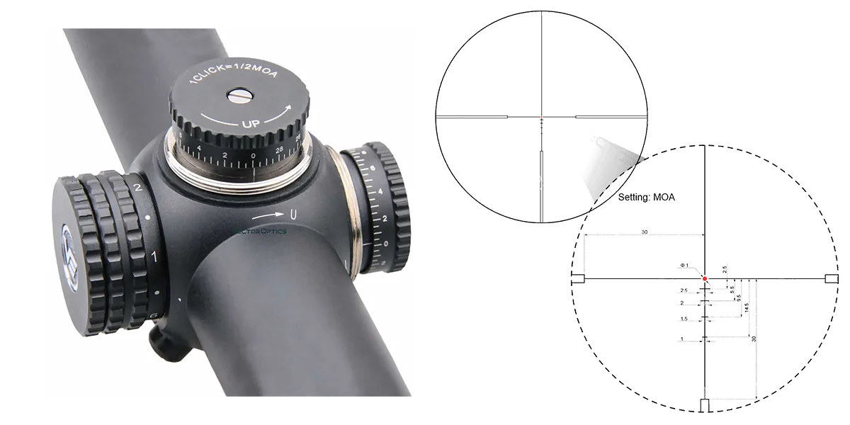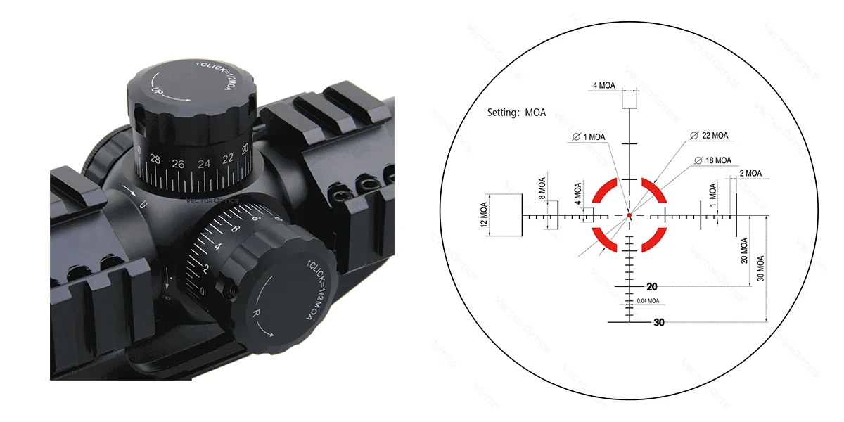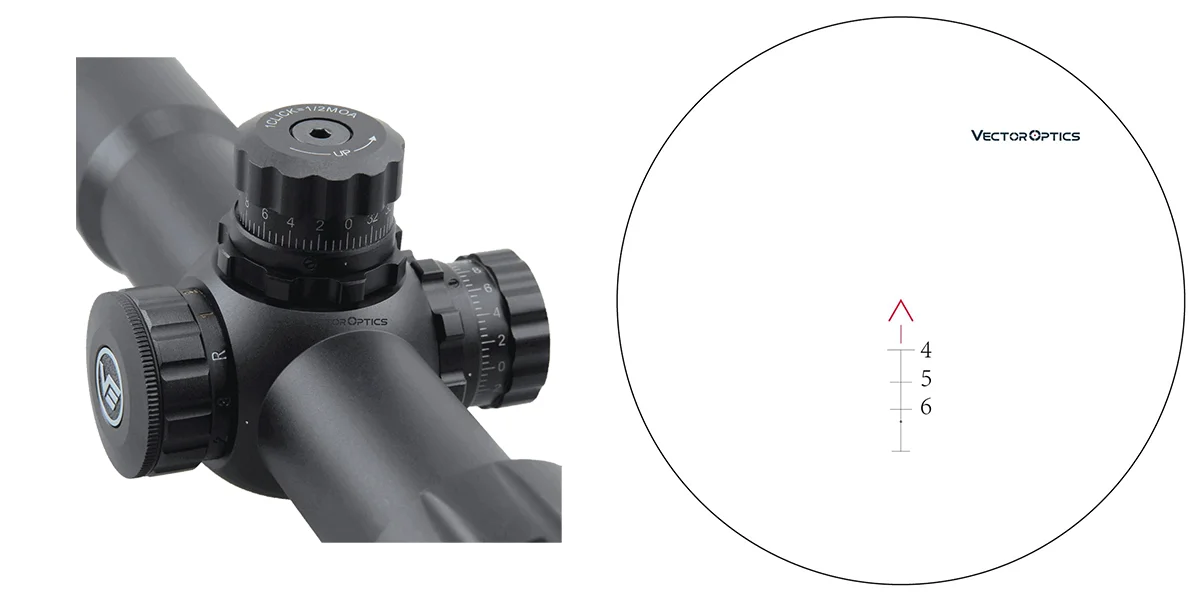 Primer plano focal, ajuste de dedo táctico de 1/2 MOA con función de bloqueo de torreta