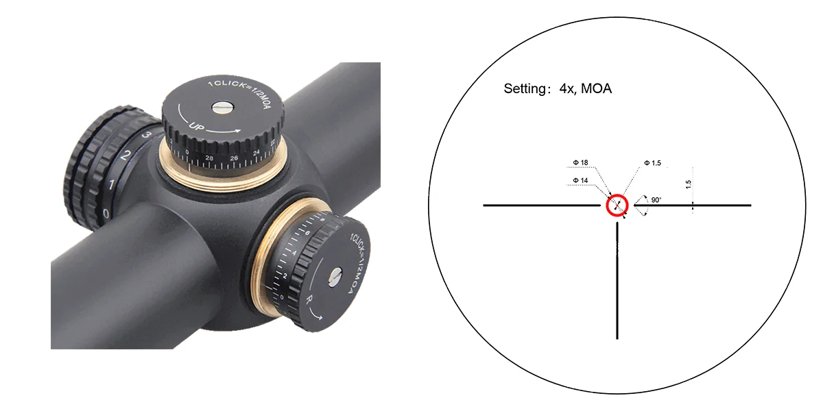 Retícula MOA de vidrio grabado M-4RD utilizada @ 4x Potencia con 6 niveles de iluminación roja en el lateral