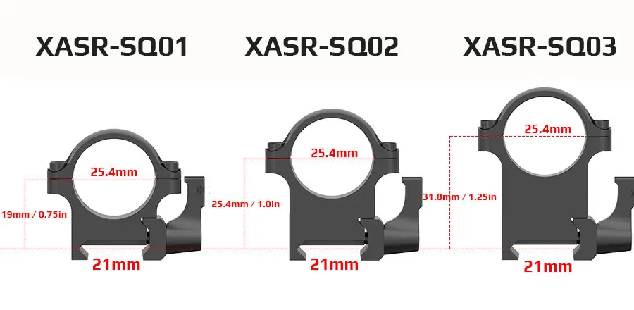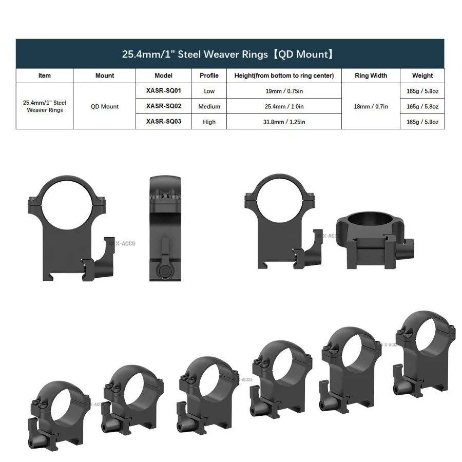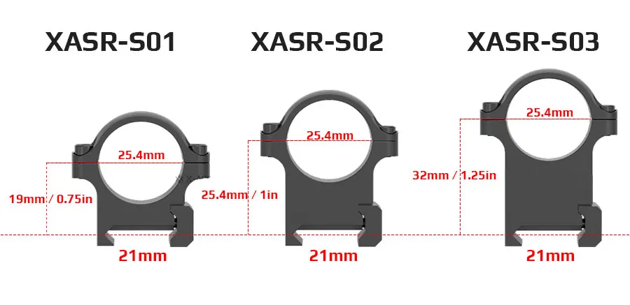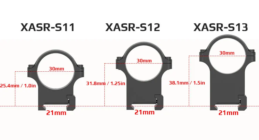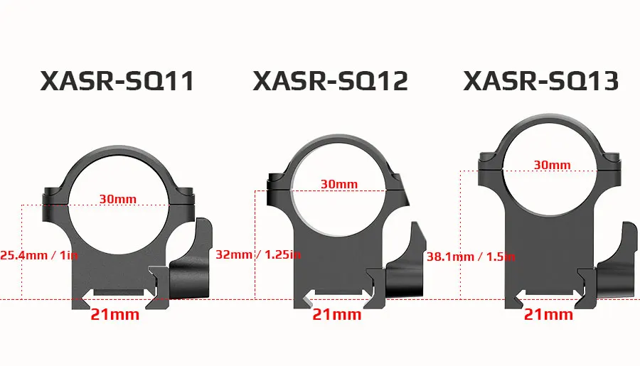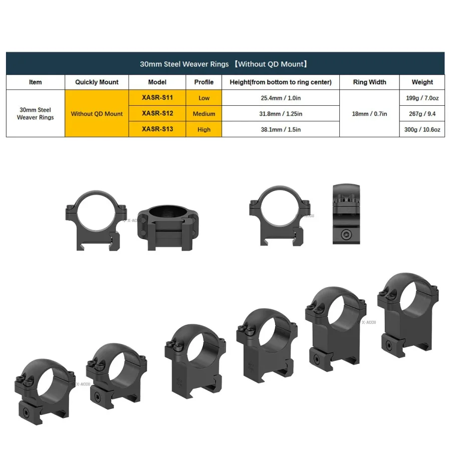 Anillos Weaver Sin soporte QD XASR-S01 Bajo 19 mm/0,75 pulgadas 18 mm/0,7 pulgadas 152 g/5,4 oz XASR-S02 Medio 25,4 mm/1 pulgada 198 g/7,0 oz XASR-S03 Alto 32 mm/1,25 pulgadas 245 g/8,6 oz Montaje QD XASR-SQ01 Bajo 19 mm/0,75 pulgadas 165 g/5,8 oz XASR-SQ02 Medio 25,4 mm/1,0 pulgadas 165 g/5,8 oz XASR-SQ03 Alto 31,8 mm/1,25 pulgadas 165 g/5,8 oz Acero de 30 mm