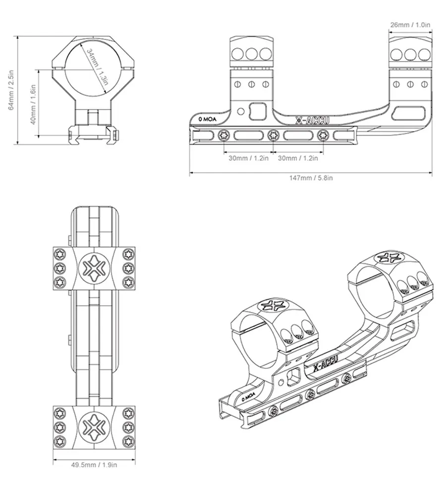 34 mm de diámetro, tipo 0 MOA, ajuste de lente objetivo de alcance máximo de 65 mm, seis tornillos por anillo