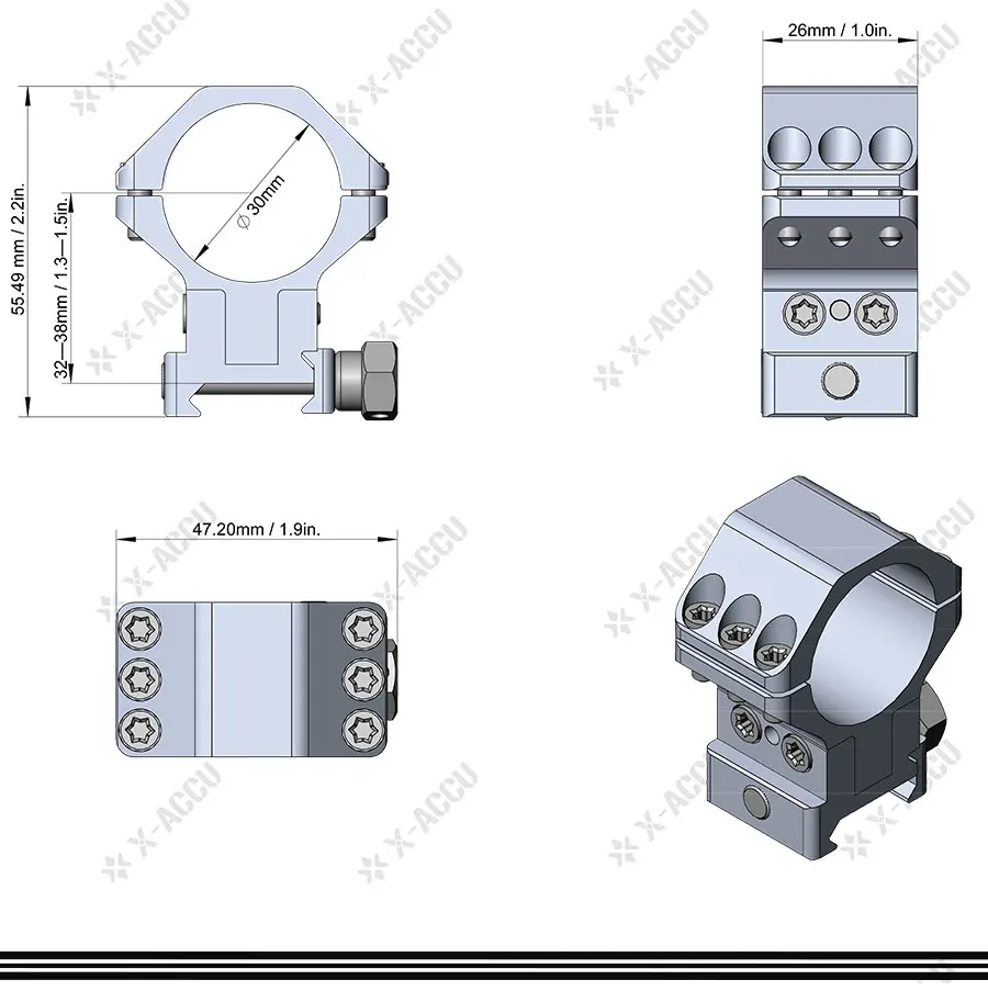 • 6 tornillos Torx por anillo, pueden ajustarse al alcance de la lente del objetivo de 56mm, CNC bien mecanizado, 1913 Picatinny