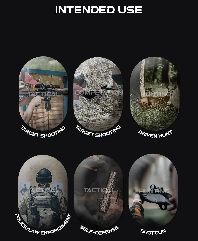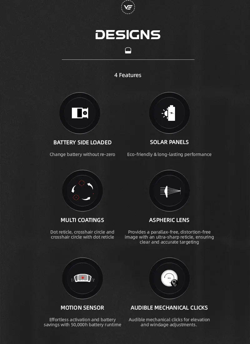 Multirreculo, seis patrones con punto central de 3 MOA, círculo de 38 MOA, crosshair de 46 MOA, valor de clic audible de 1 MOA