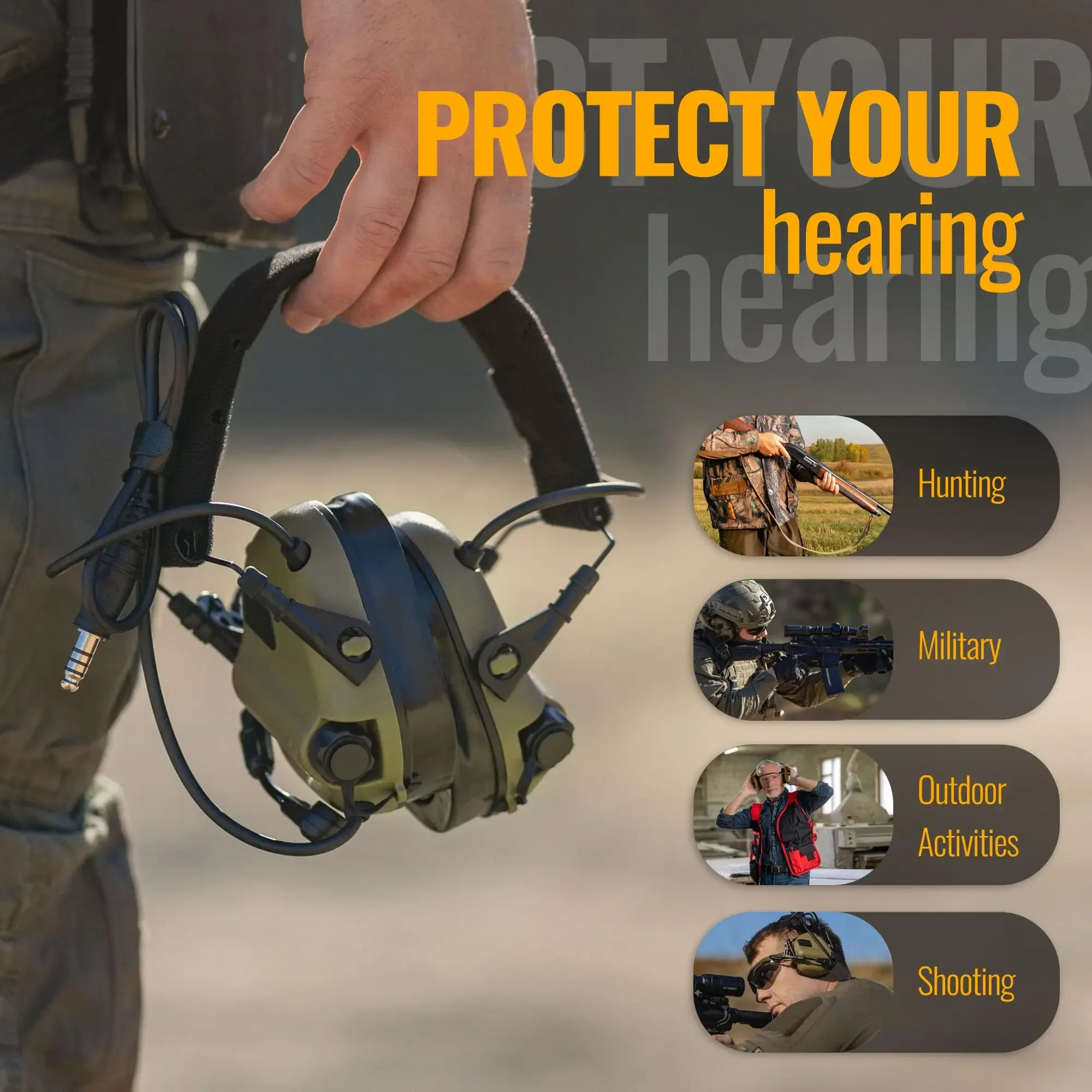 ADVERTENCIA:El conector militar no puede utilizar PTT Element o Z-Tactical.Puede utilizar Earmor PTT o TCI/Nexus PTT.DETALLES:La armadura del oído™ La orejera de protección auditiva protege contra ruidos peligrosos y al mismo tiempo le permite escuchar sonidos ambientales.Los sonidos son detectados por dos micrófonos direccionales y reproducidos por los parlantes dentro de las orejeras.El M32 proporciona protección audible en áreas ruidosas con ruido impulsivo, como zonas de uso de armas de fuego.Los micrófonos montados en las orejeras mejoran la conciencia situacional del usuario, al tiempo que le permiten escuchar sonidos de un entorno cercano y proteger su audición.Los sonidos nocivos se limitan a un nivel seguro de 82 dB y los más bajos se amplifican.Beneficios clave de los protectores auditivos activos: 1.Le permite escuchar normalmente e incluso mejorar los sonidos estándar: habla, comandos, instrucciones, sonidos del entorno 2.Proteja su audición durante el disparo 3.Fortalece los sonidos estándar: con control de volumen te permiten escuchar mejor que sin orejeras.La versión modernizada Mod 4 incluye: - Nuevas roscas para desatornillar fácilmente - Retraso del botón de 3 segundos para evitar apagado accidental - Eslingas de silicona para tapas del compartimiento de la batería - Tapa de batería de metal mejorada - Seguimiento de voz dinámico - Inmunidad a RF mejorada - Materiales mejorados de la caja de los auriculares - Actualizados nuevos placas de circuito y micrófonos dinámicos
