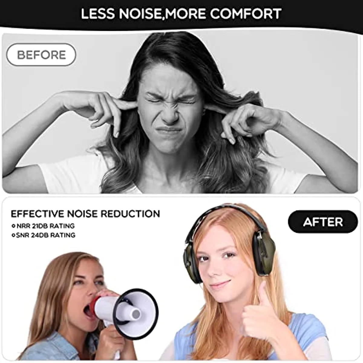 Ampliamente aplicable: las orejeras de protección auditiva son ideales para disparar, cazar, volar en avión, eventos deportivos, estudiar, proyectos de carpintería y cortar el césped; se pueden utilizar para operar maquinaria pesada o proyectos de paisajismo, ayudando a crear un entorno auditivo seguro y cómodo.