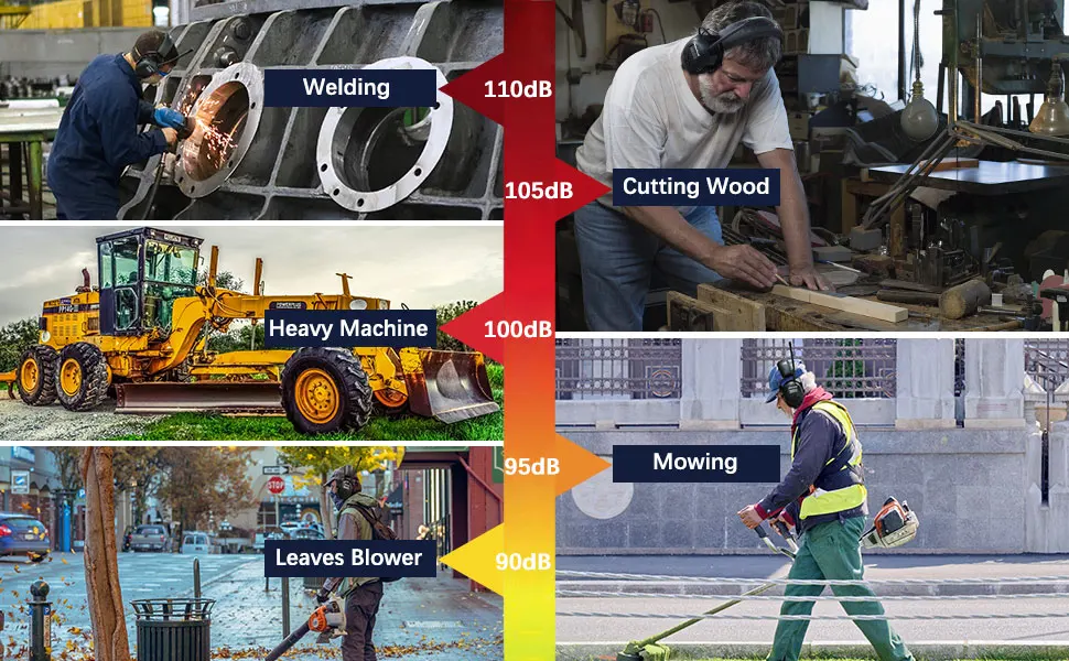 NRR 25dB/SNR 30db-respaldado por la protección certificada de ANSI S3.19-1974 (Instituto Nacional Americano de Estándares) y CE EN 352-1 (estándar europeo), reduce eficazmente el ruido que te rodea y te permite disfrutar de música y llamadas claras. Perfecto para cortar, soplar nieve, construcción, paisajismo, carpintería y otros entornos ruidosos