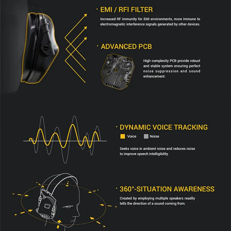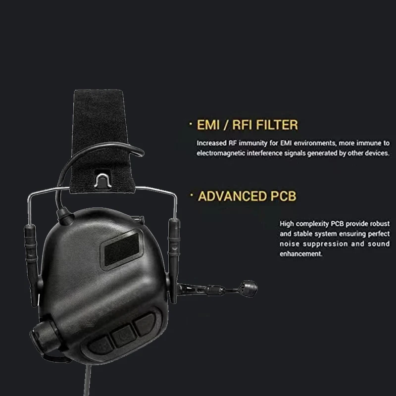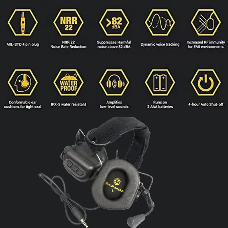 El M32 proporciona protección audible en áreas ruidosas con ruido impulsivo, como zonas de uso de armas de fuego. Los micrófonos montados en las orejeras mejoran el conocimiento de la situación del usuario, al tiempo que le permiten escuchar sonidos de los alrededores y proteger su audición. Los sonidos dañinos se limitan a un nivel seguro de 82 dB, y los más bajos se amplifican.
