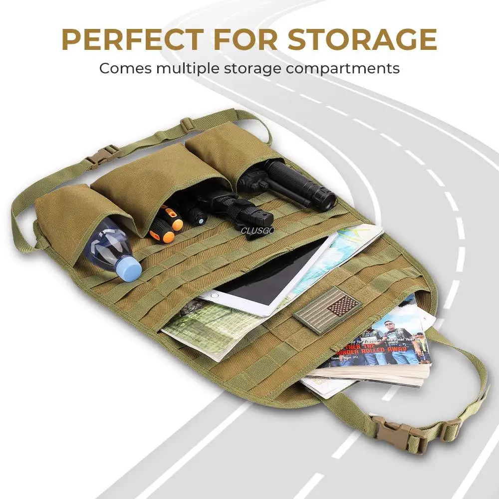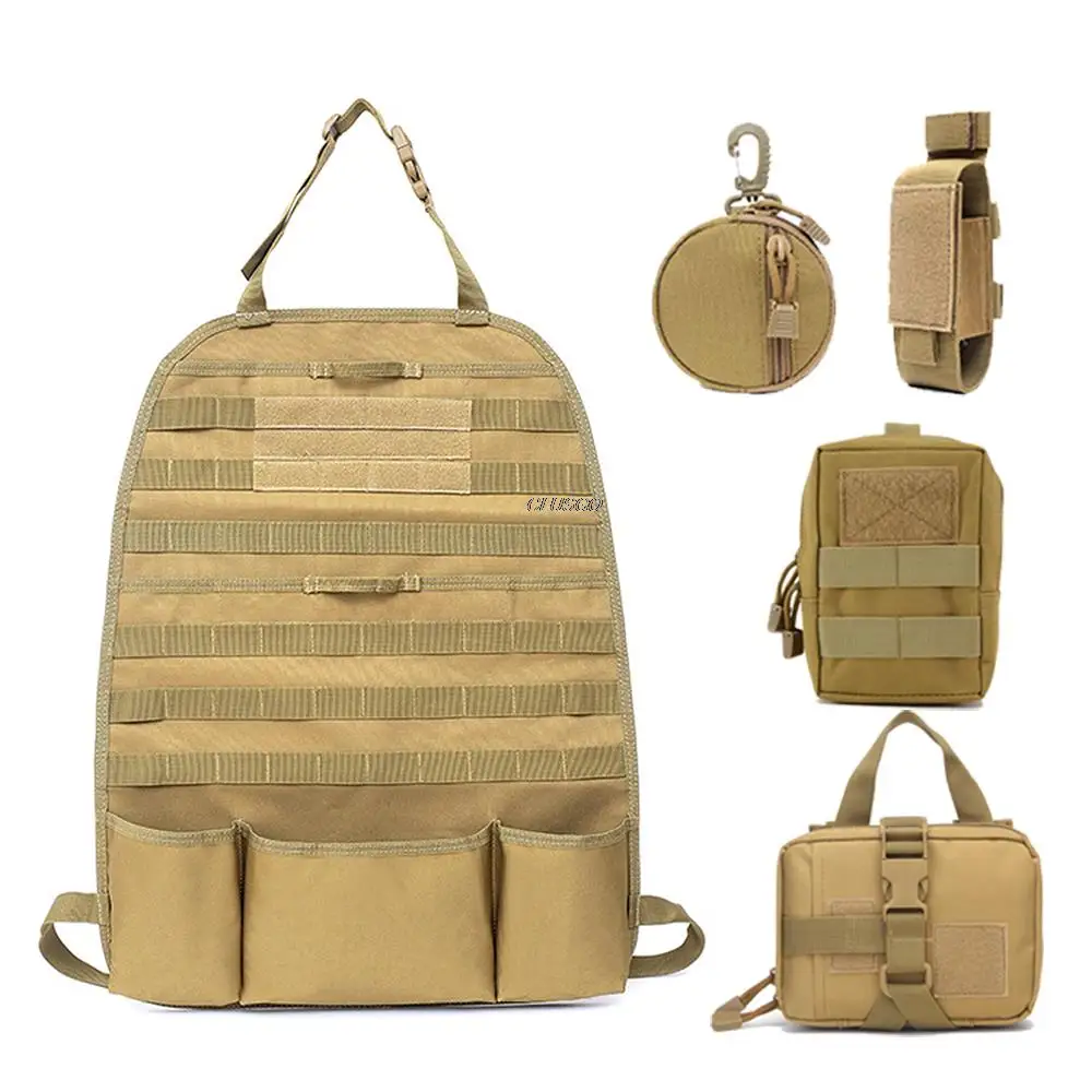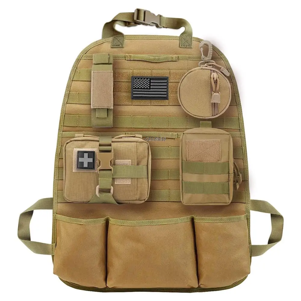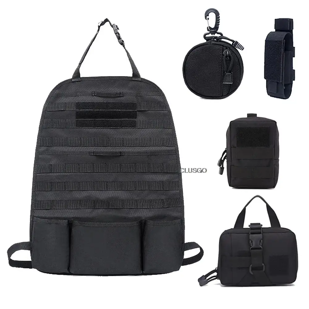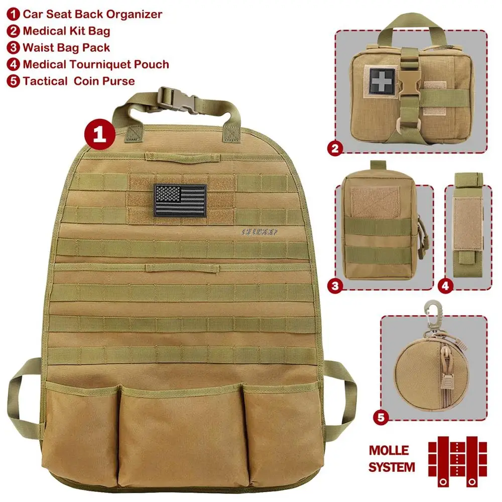 【Almacenamiento múltiple】 Organizador de respaldo de asiento táctico 5 en 1 con 4 bolsas desmontables: Bolsa de kit médico x 1, paquete de riñonera x 1, bolsa de torniquete médico Molle x 1, monedero táctico x 1. El panel del asiento del automóvil viene con 2 compartimentos de cierre de gancho y bucle. 2 bolsillos interiores con velcro, un bolsillo medio en la parte superior y un bolsillo grande en la inferior. Hay 2 bolsas en la parte inferior para almacenamiento adicional. Mantenga su asiento trasero limpio y ordenado. (Parche de bandera no incluido)