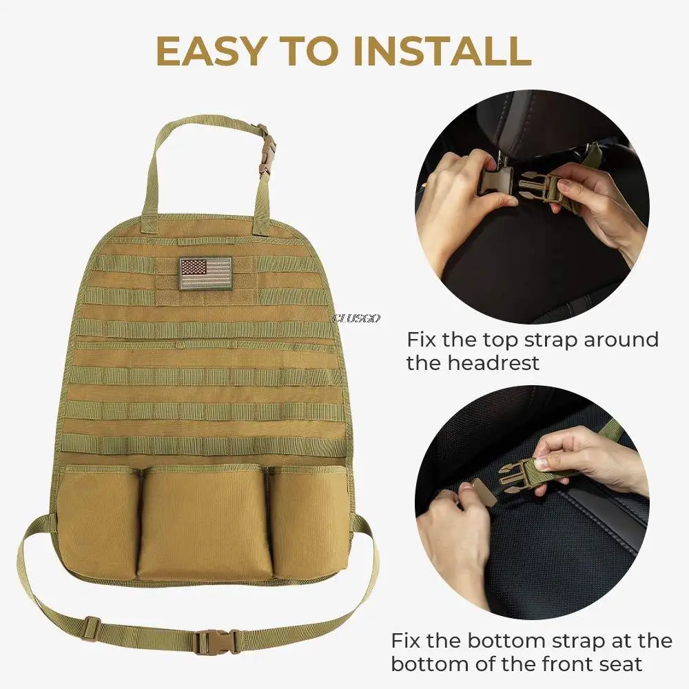 【Fácil de configurar】La funda trasera del coche cuenta con 2 correas ajustables y hebilla duradera para adaptarse alrededor del reposacabezas y en la parte inferior entre el respaldo del asiento y la base. Los paneles del respaldo tienen 6 filas de paneles de molle para colocar bolsas de molle, kits de emergencia, bolsas EMT, bolsa de linterna y bolsa de botella de agua para ampliar su espacio de almacenamiento.