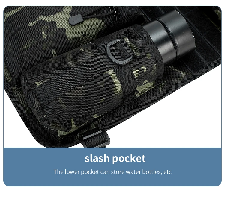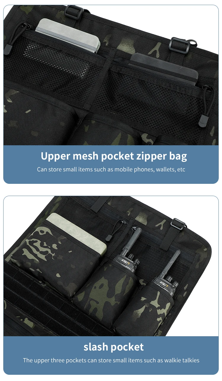 Múltiples bolsillos independientes pueden almacenar bebidas, controles remotos, teléfonos móviles, billeteras y otros artículos;Diseño de sistema de instalación MOLLE, puede instalar bolsas para teléfonos móviles, bolsas de almacenamiento, bolsas para walkie-talkie y otros subpaquetes, o colgar walkie-talkies directamente