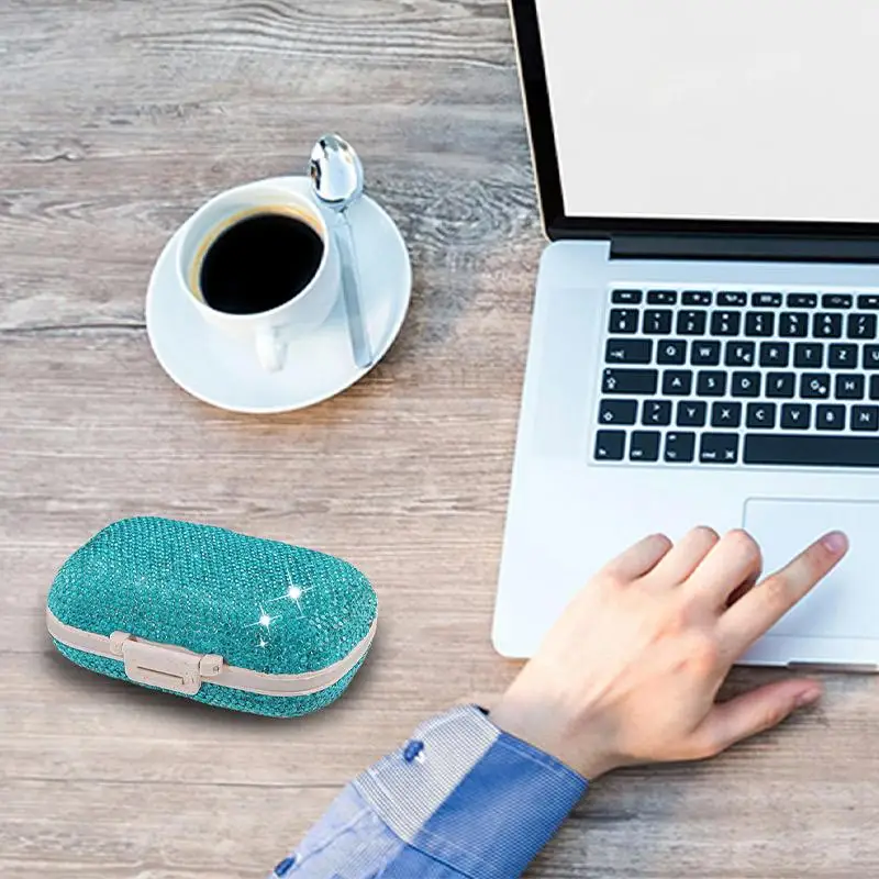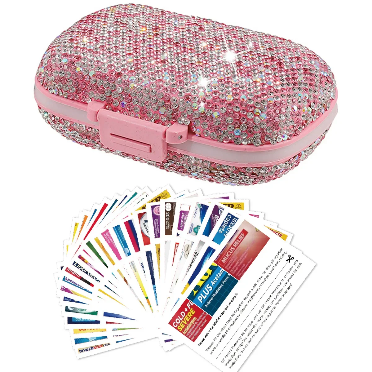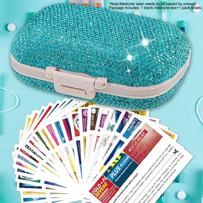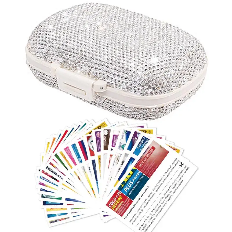 Organizador de pastillas de viaje con diamantes de imitación 175, etiquetas de medicina, 8 compartimentos, a prueba de humedad, Mini organizador de medicamentos