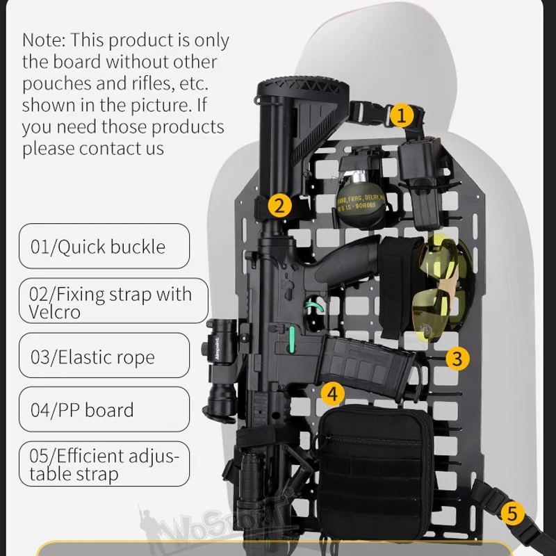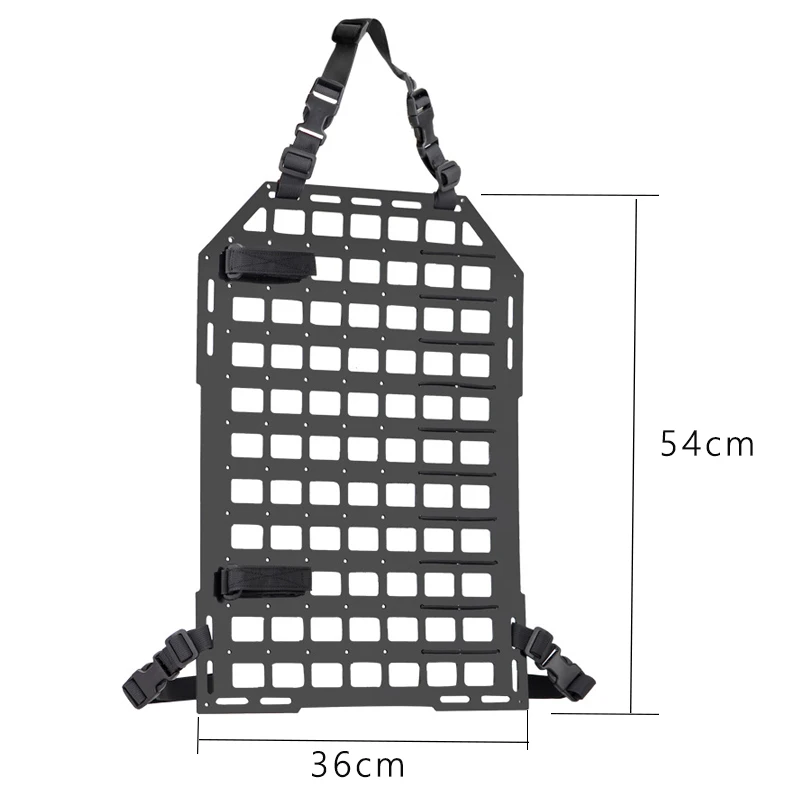 Product Name: Tactical seatback equipment for car Product size: 54*36CM Product net weight: 830G Main material: PP material Applicable scene: For car chair NOTE:THERE MAY BE SLIGHT ERRORS IN MANUAL MEASUREMENT, PLEASE REFER TO THE ACTUAL PRODUCT.