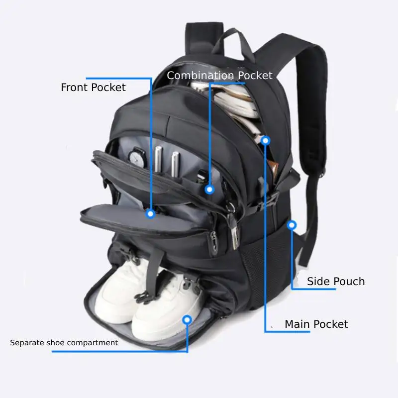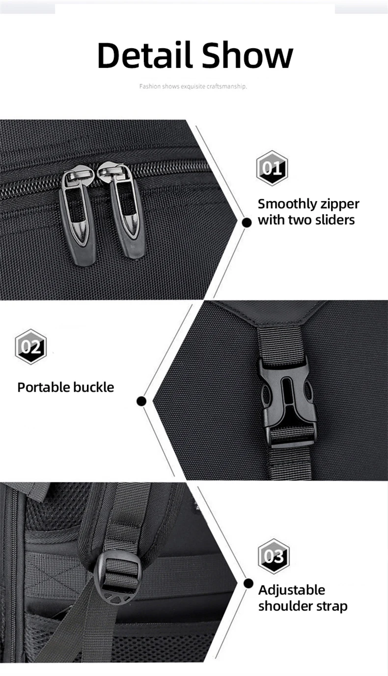 1.Large-capacity main bag set, built-in computer compartment, multi-combination bag design, the bag body can be expanded backpack, back expansion zip pull open, the bag body can be expanded 6cm, with an independent shoe compartment, travelling storage more convenient.