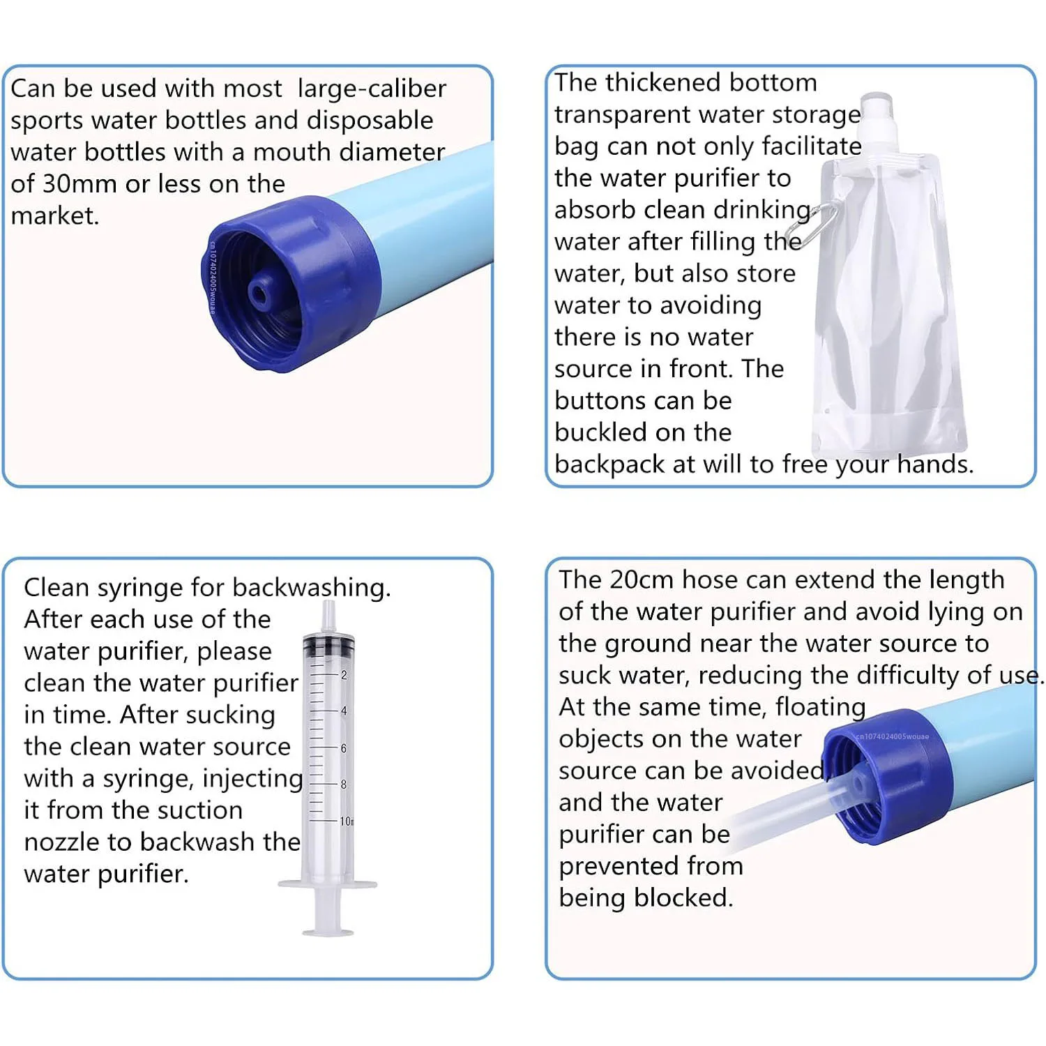La filtración de agua personal portátil de supervivencia está hecha de plástico sólido ABS apto para uso alimentario sin BPA, que puede garantizar la seguridad del agua potable y reducir la contaminación ambiental.