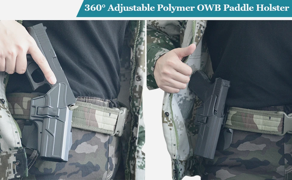 Retención de nivel II: sistema de bloqueo automático, sujeción de la pistola en la funda OWB para garantizar la máxima seguridad, active la liberación presionando el botón con el dedo índice para lograr el acceso de la pistola