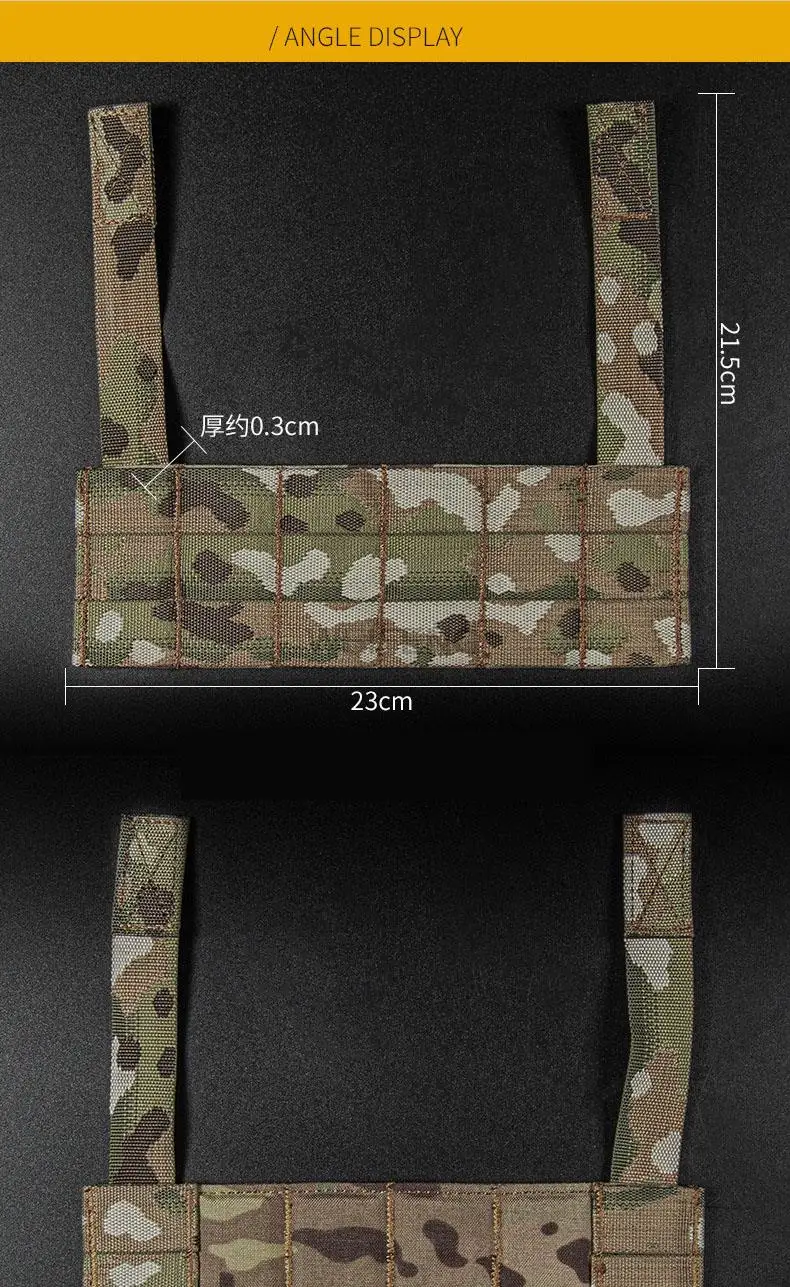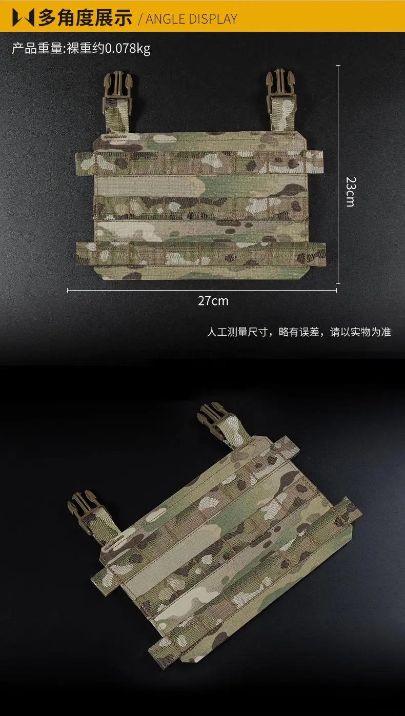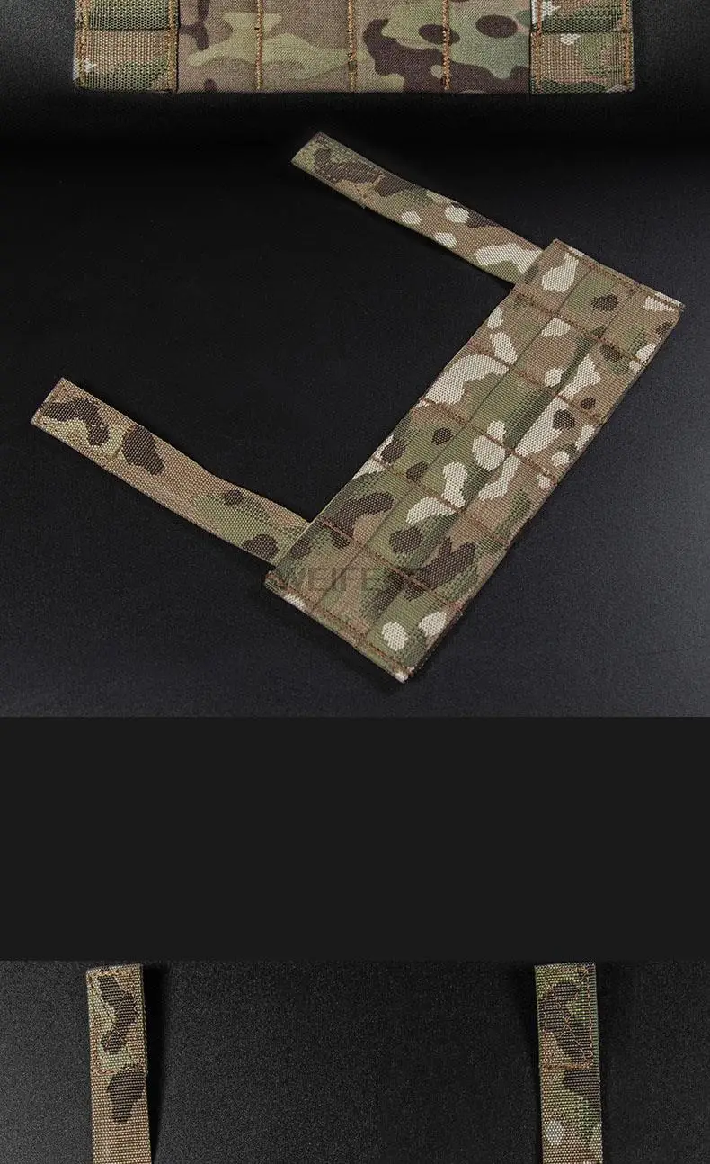 Nombre del producto: Placa MOLLE Embalaje del producto: Bolsa empaquetada Tamaño del producto: 23*22*0,6 cm Peso neto del producto: 0,05 KG Peso bruto del producto: 0.051KG Color del producto: negro, verde, marrón, CP, BKCP, gris Escena aplicable: actividades en equipo, juegos tácticos, accesorios de película Material principal: tela Cordura