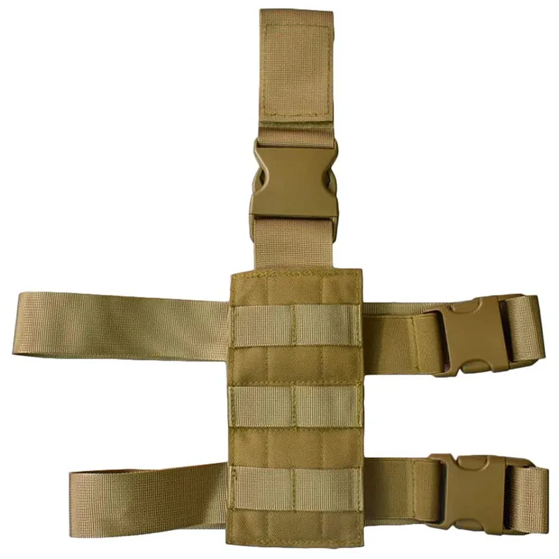 Una correa para conectar el cinturón; 2 correas para las piernas con hebillas de liberación rápida, se pueden usar atadas a la pierna o unidas a la cintura a través de un cinturón (cinturón táctico incluido), las correas para las piernas son totalmente ajustables y extraíbles.