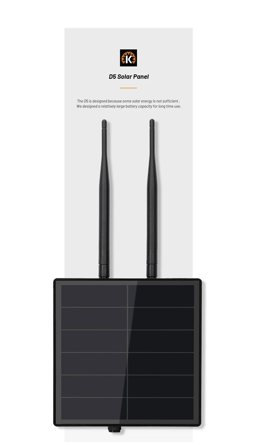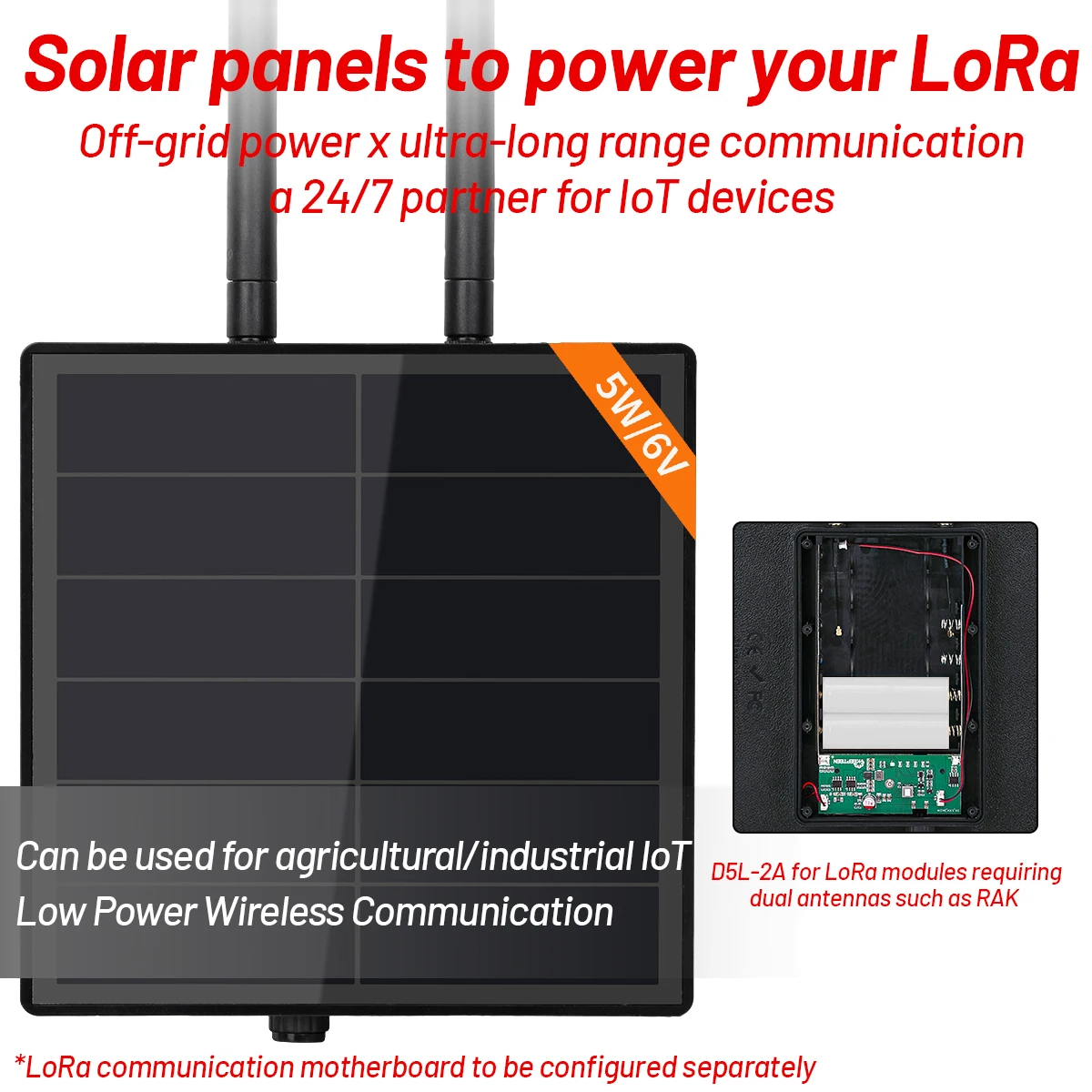 Panel solar D5L con controlador incorporado, con antena LoRa de 860MHz~960MHz.Puedes personalizar Solar RAK LoRa tú mismo.El panel solar de 5 W alimenta continuamente su LoRa.