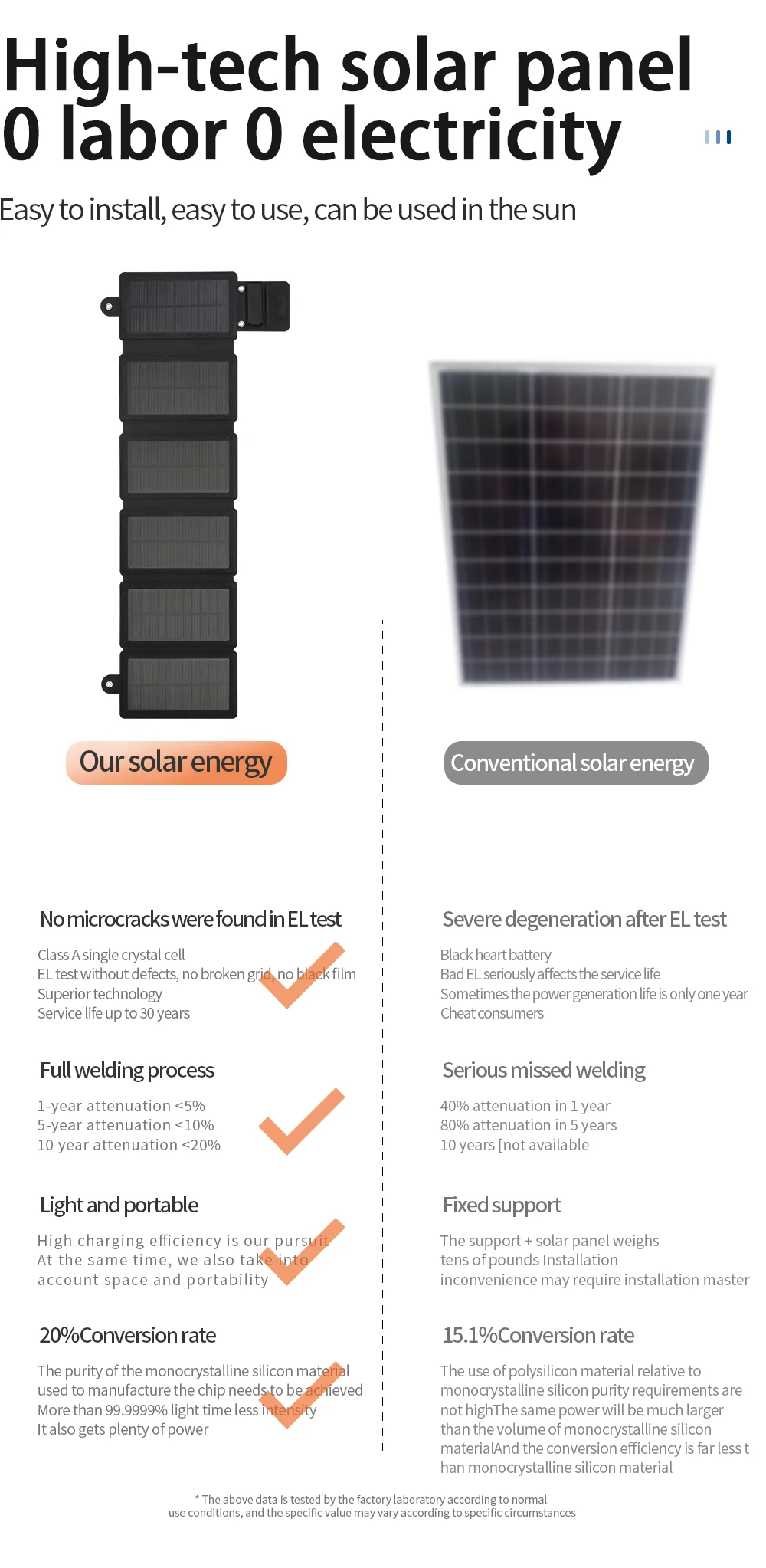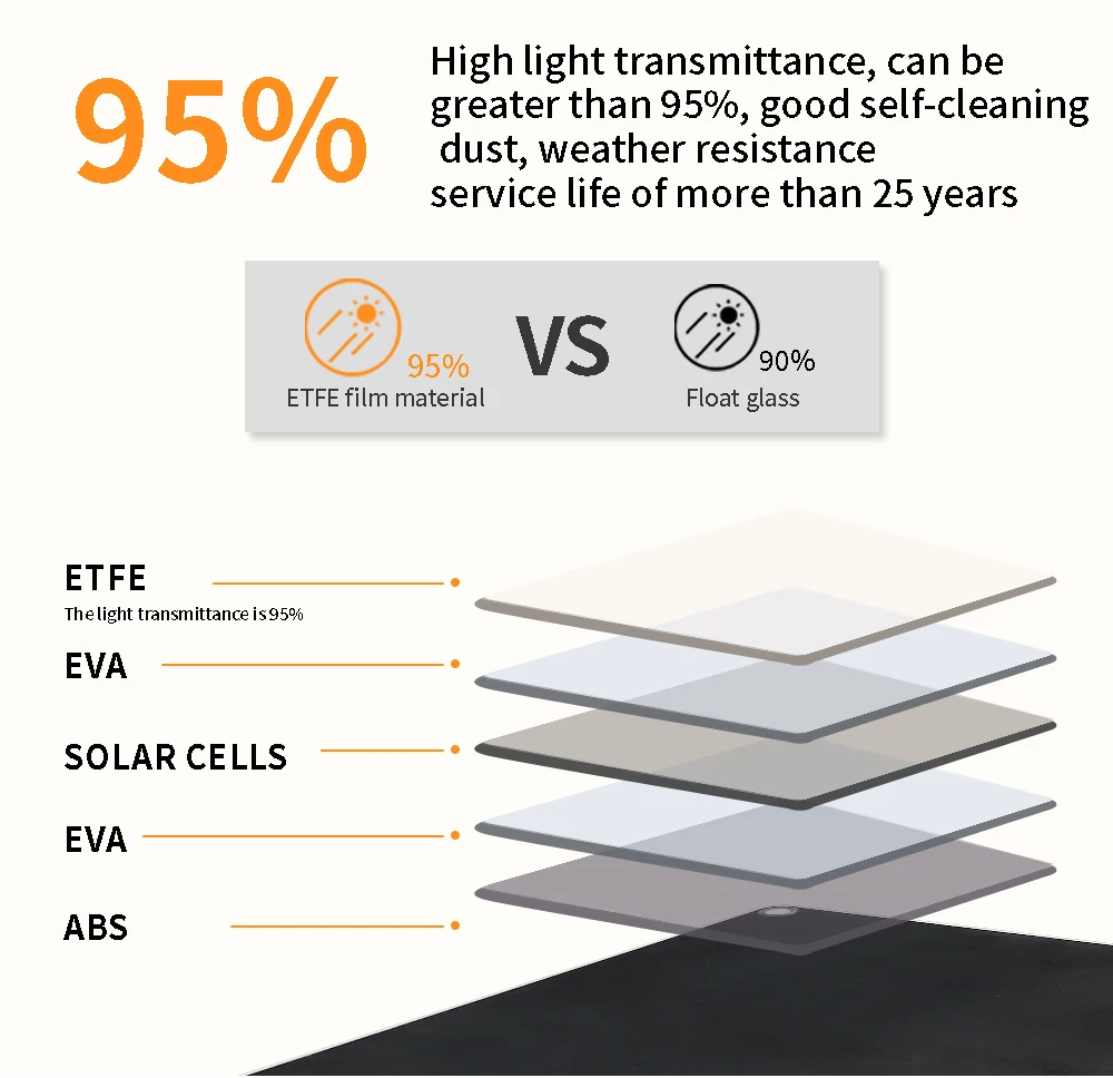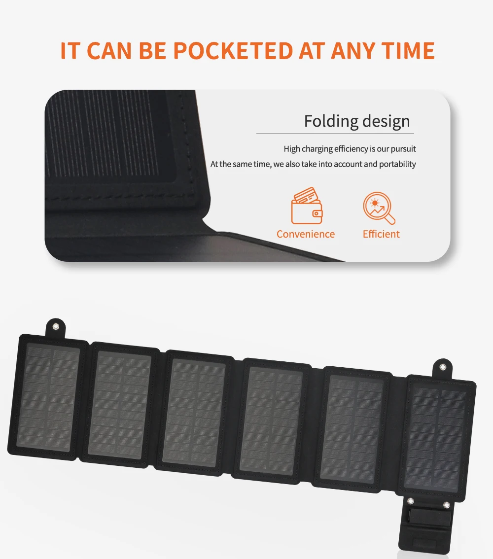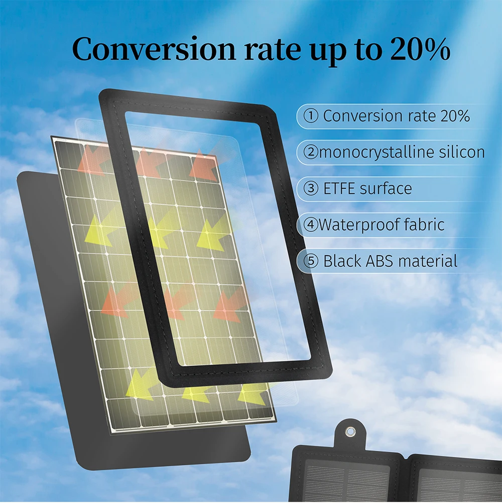 3. Hecho de material de silicio monocristalino, 20% de alta eficiencia de generación de energía y eficiencia de carga rápida, no hay necesidad de preocuparse por los problemas de carga.