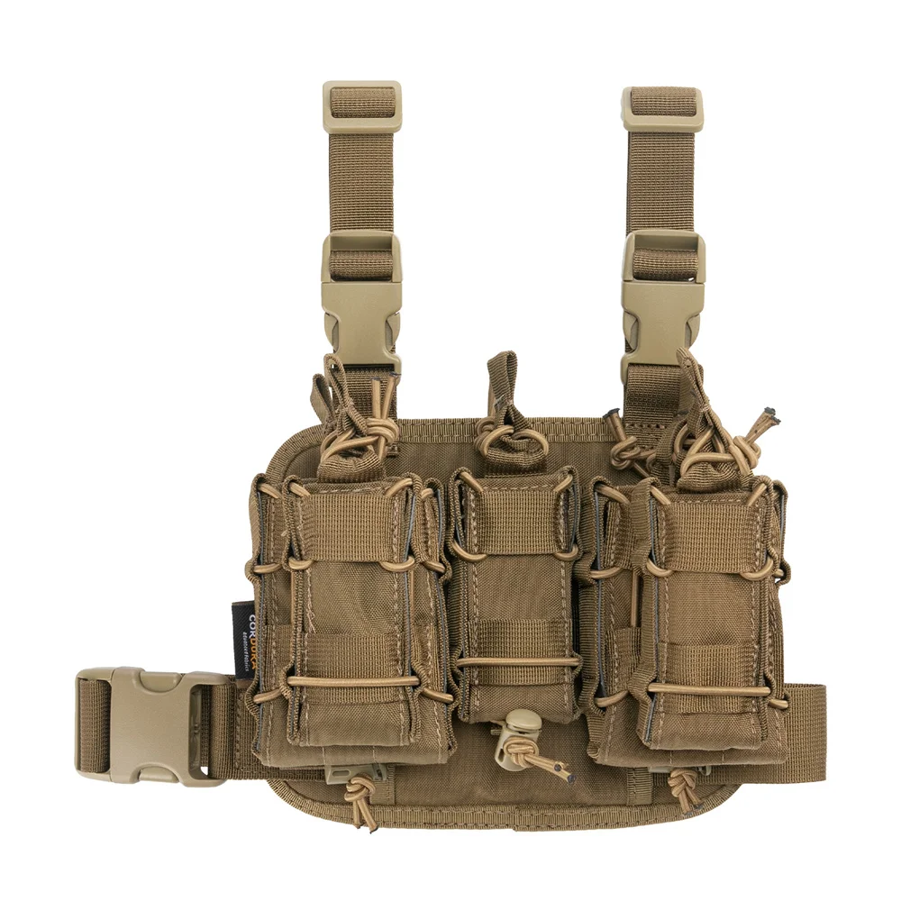Constituido por material de nailon cor-dura duradero y de alta calidad, un excelente accesorio para equipo de supervivencia o camping. Contiene una pata táctica colgante, tres bolsas para cargadores Molle que se pueden colocar con cargadores de 5 piezas.