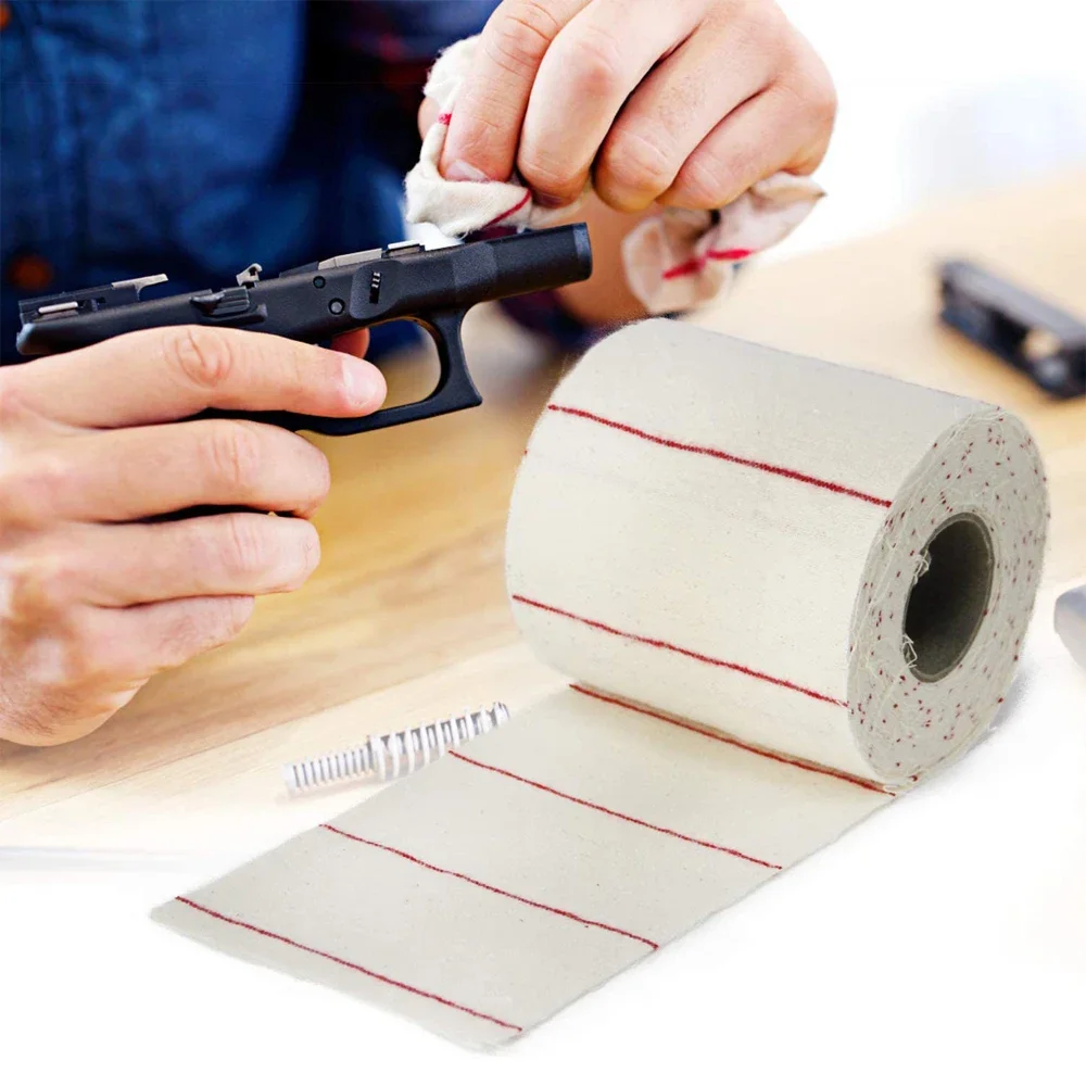 [Material 100 por ciento algodón] Este rollo de paño de limpieza para armas es una opción perfecta para tener en el kit de limpieza de armas de cada usuario de armas.Fabricado con material de mezcla de algodón genuino.Se siente tan suave que evita dañar tu arma de fuego.