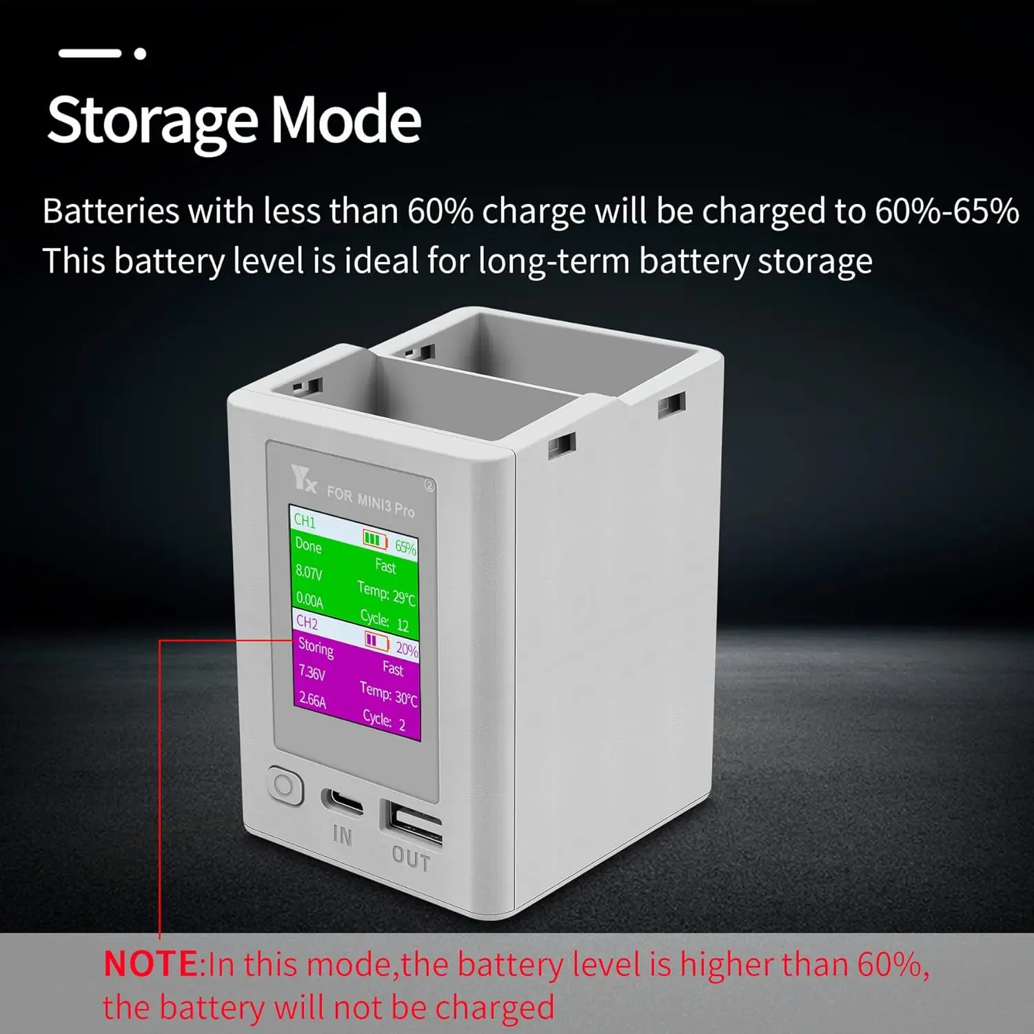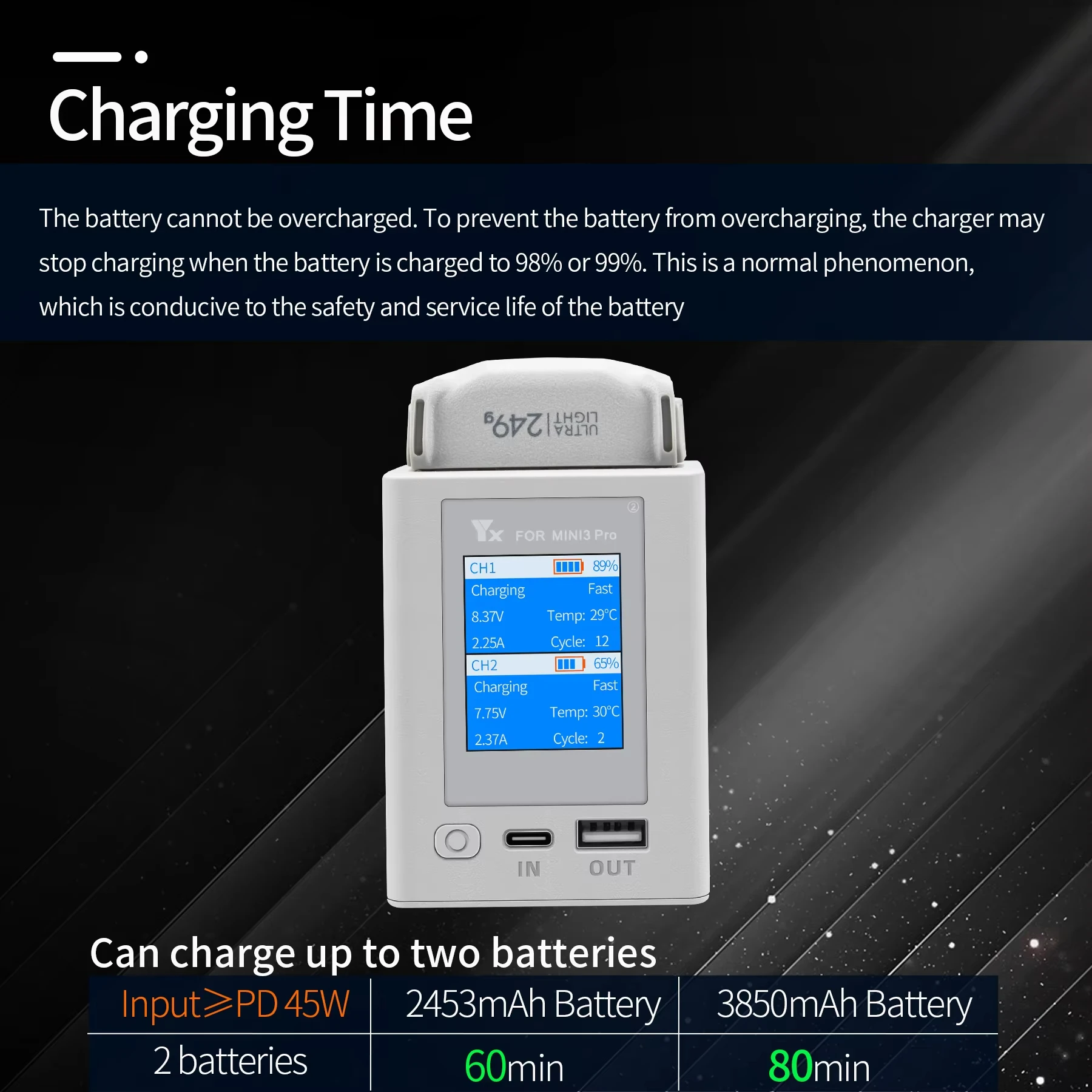 5.Puedes poner hasta 2 baterías y cargarlas de alto a bajo.Las baterías de alta potencia se cargan primero.