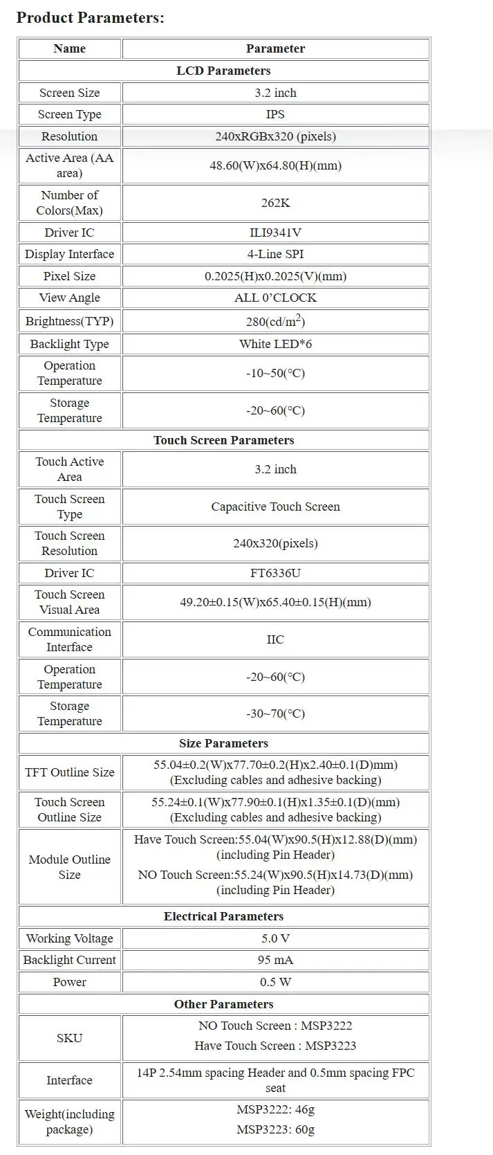 Especificación del módulo IPS SPI de 3,2 pulgadas