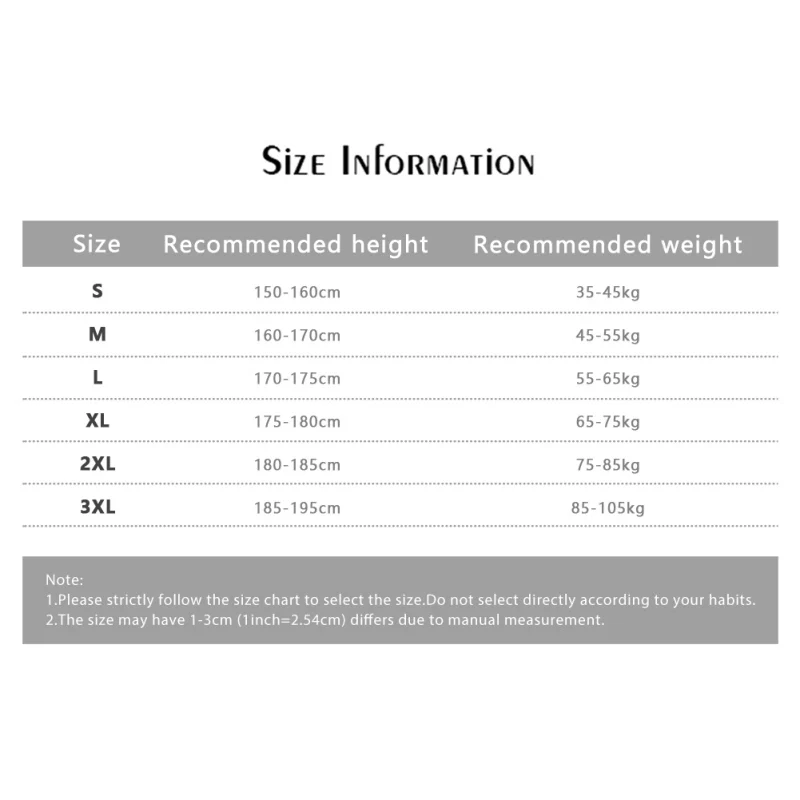 Elija su peso en función de su peso. Si tiene Barriga, se recomienda tomar una talla más grande, y si es delgada, se recomienda tomar una talla más pequeña. Esta Tabla de tallas es solo de referencia.