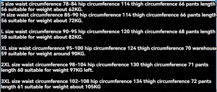 Tamaño 3XL circunferencia de cintura 102-108 circunferencia de cadera 134 circunferencia del muslo 72 longitud de los pantalones 61 adecuado para un peso de alrededor de 105 kg