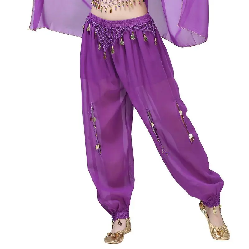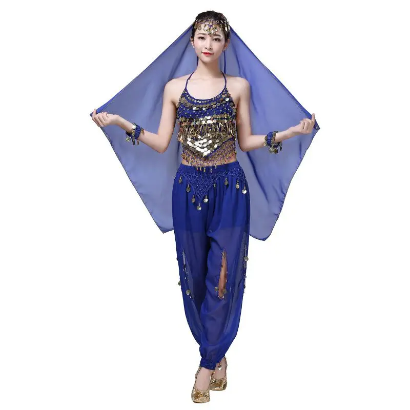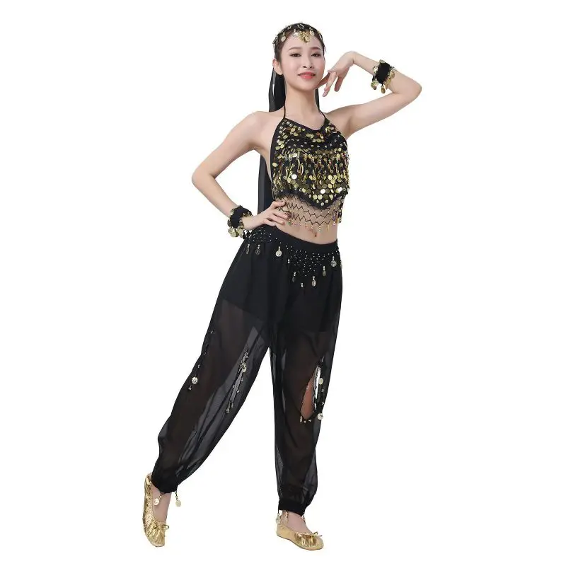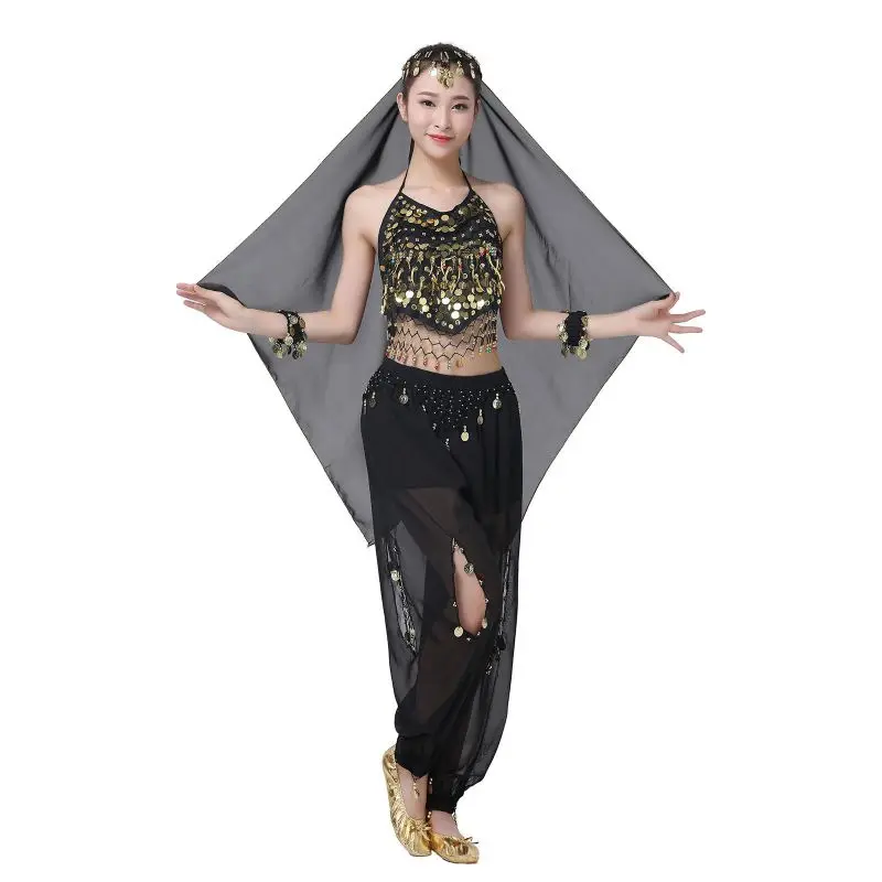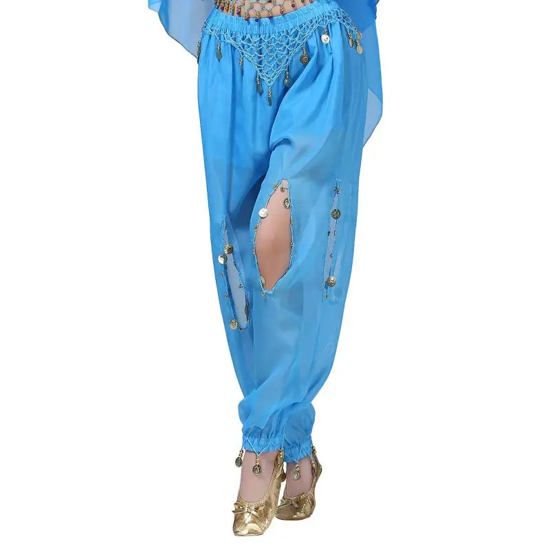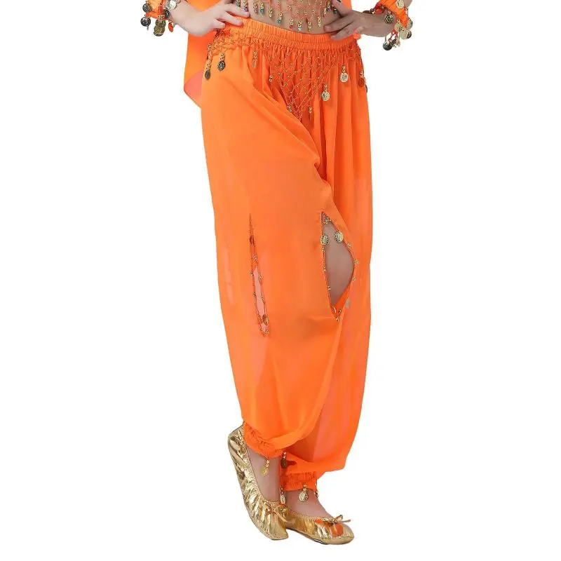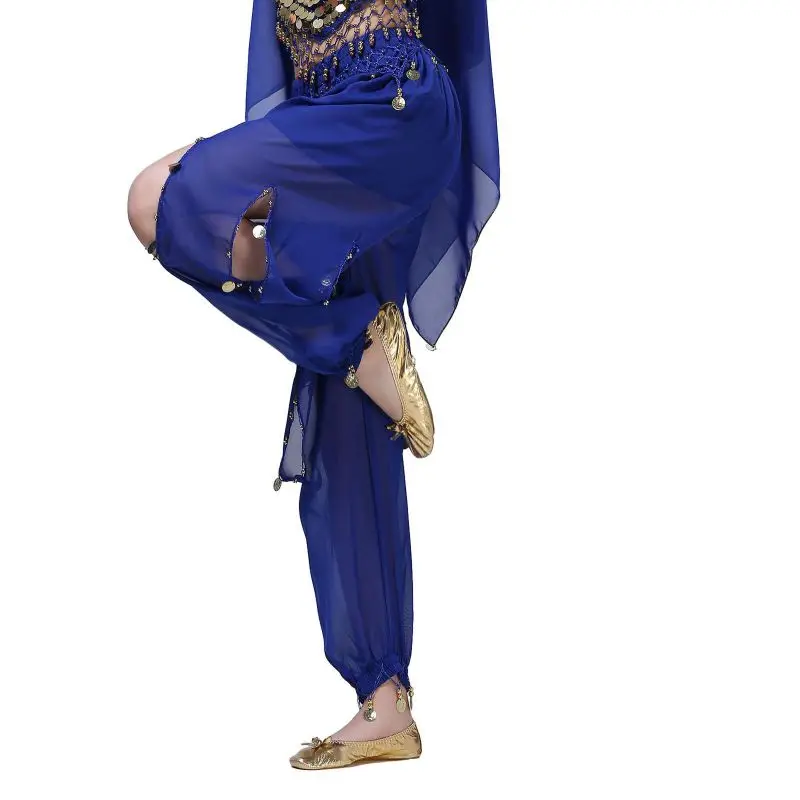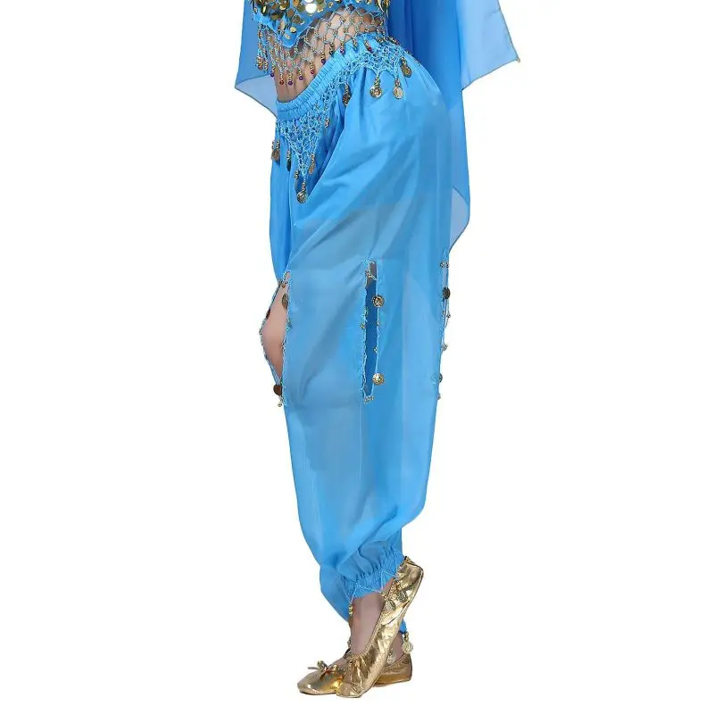 Un par de pantalones de danza del vientre para mujer o un par de top de danza del vientre para mujer + pantalones + pañuelo colgante para monedas + pulsera