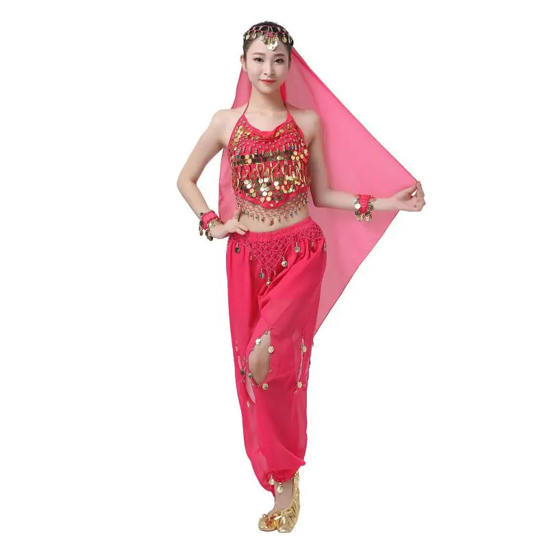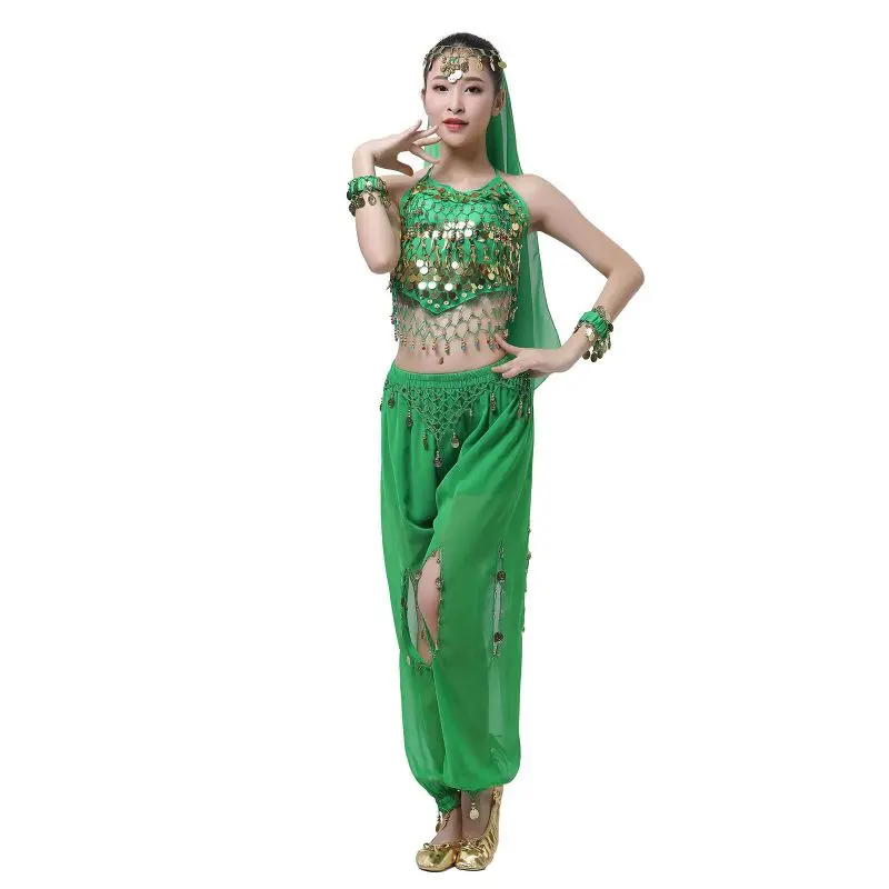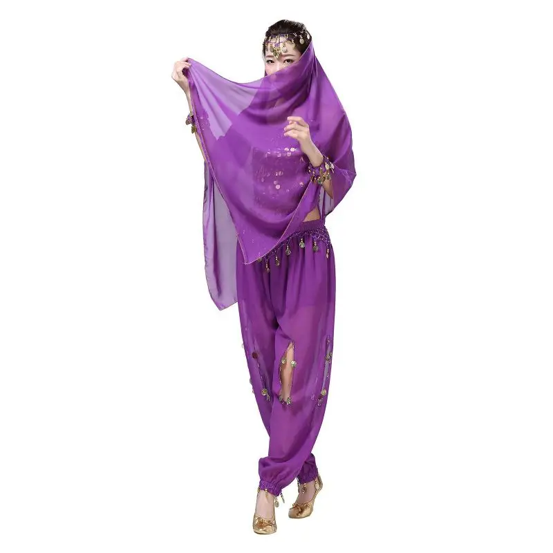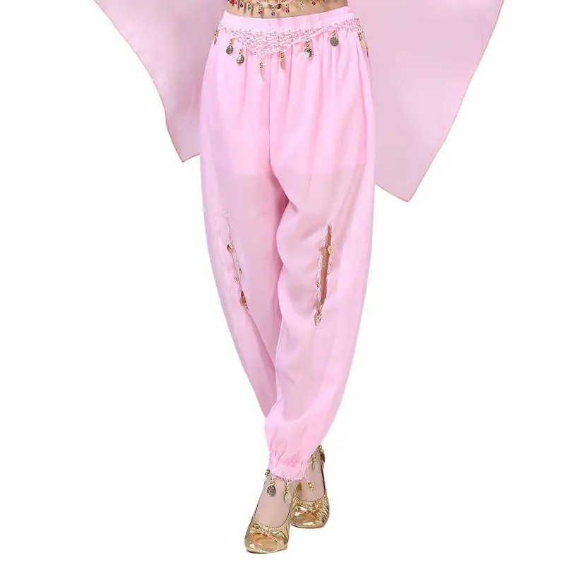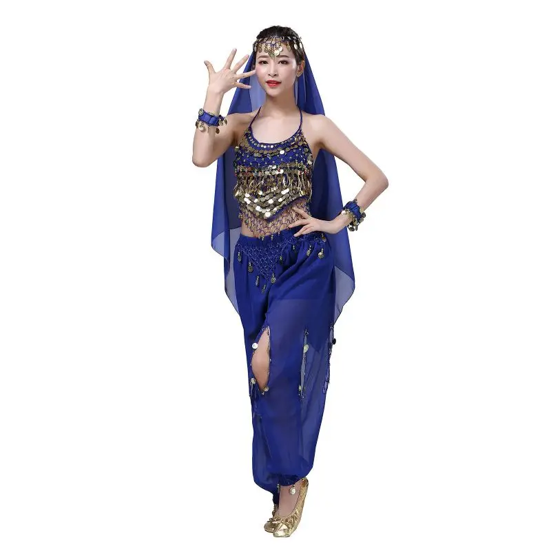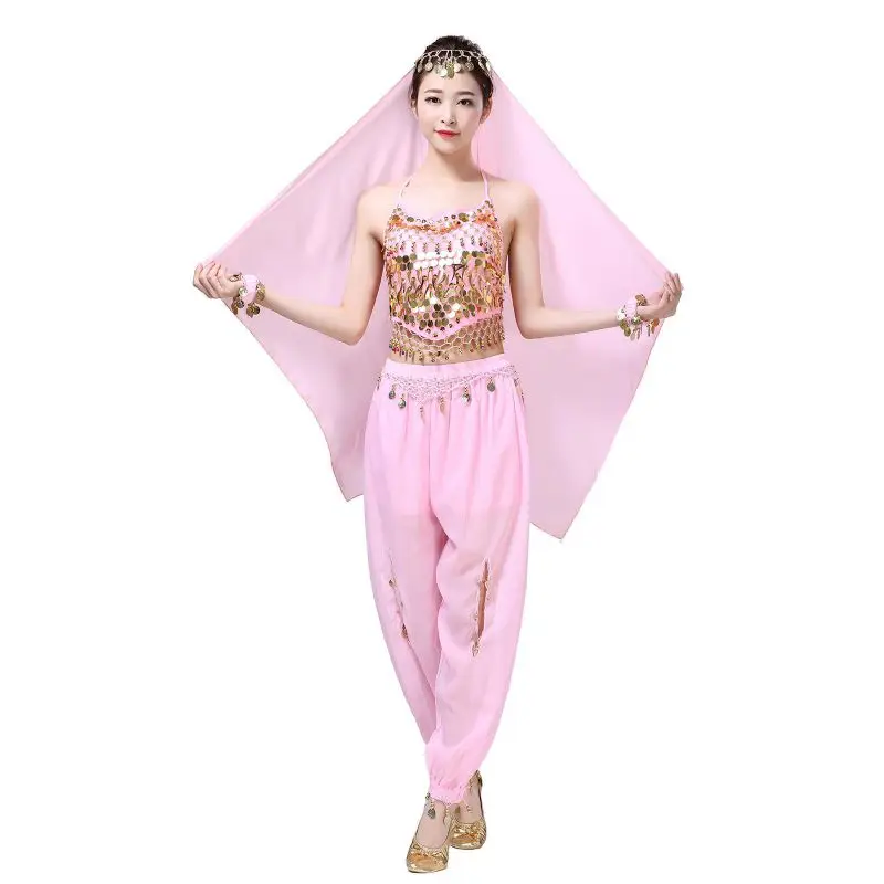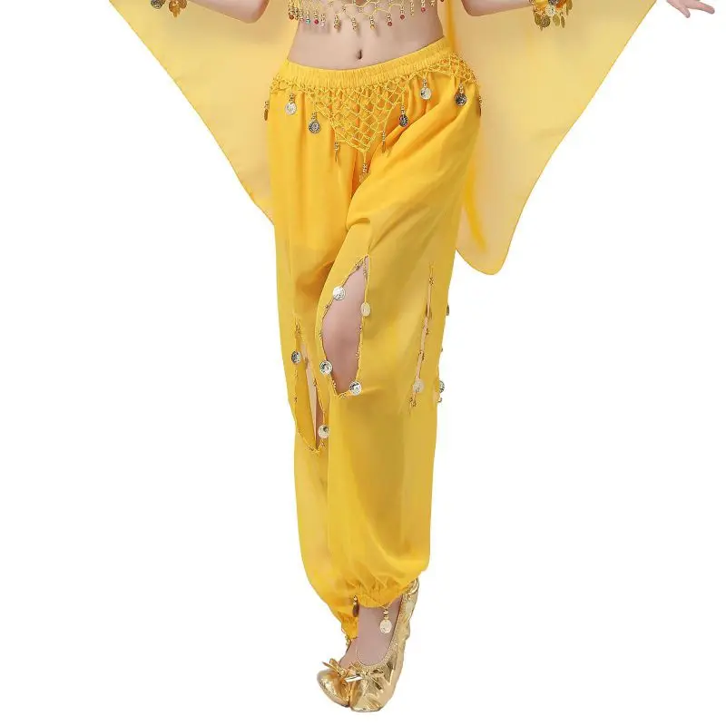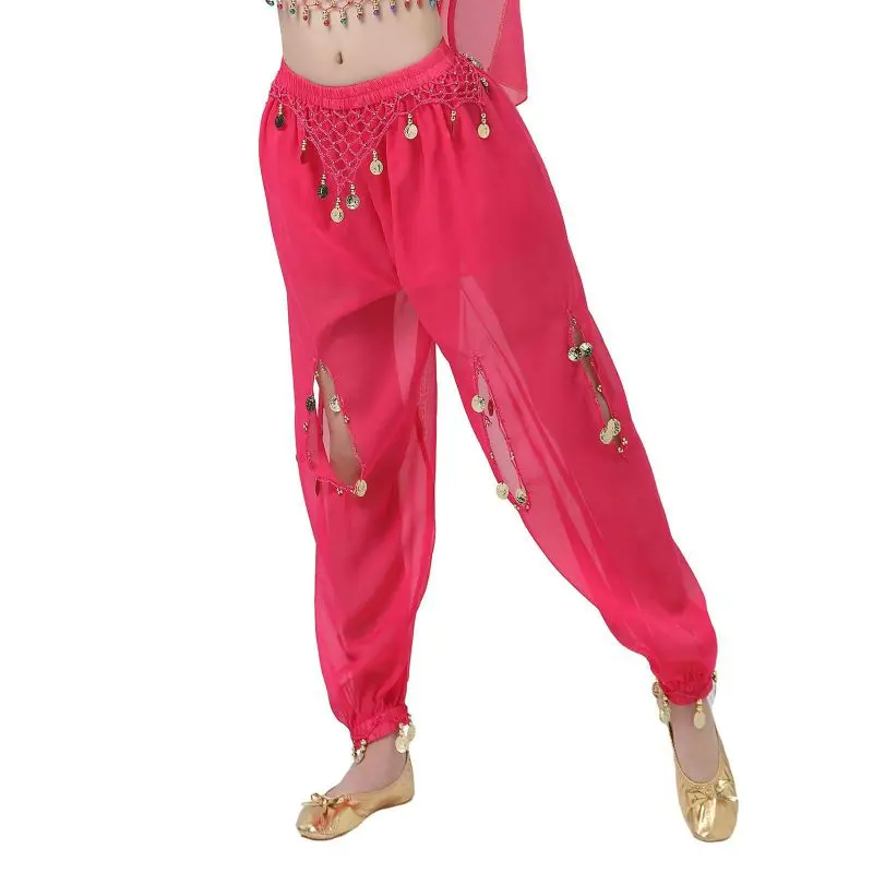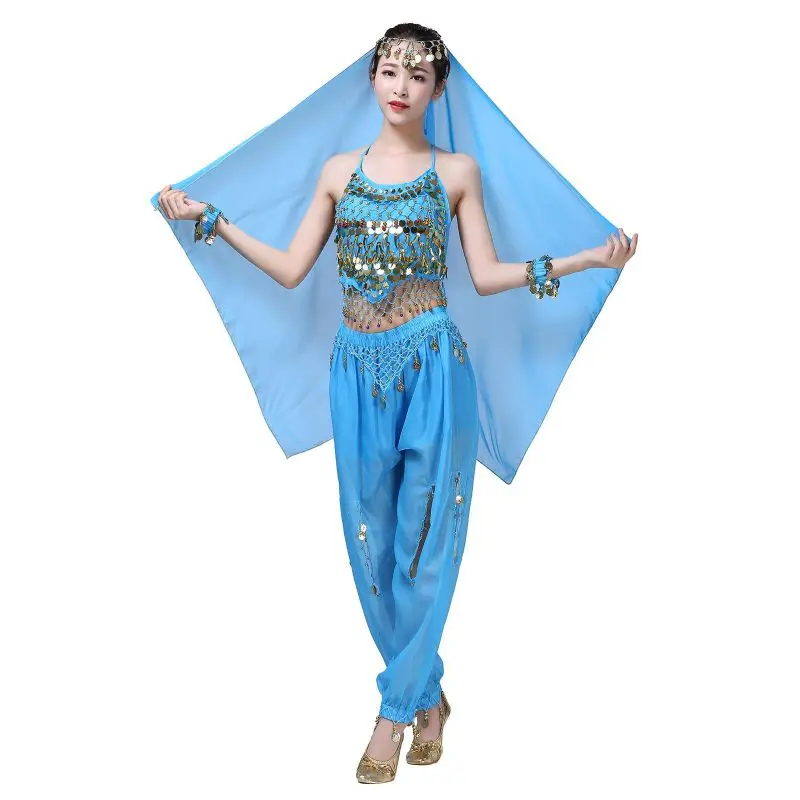 Un par de pantalones de danza del vientre para mujer o un par de top de danza del vientre para mujer + pantalones + pañuelo colgante para monedas + pulsera