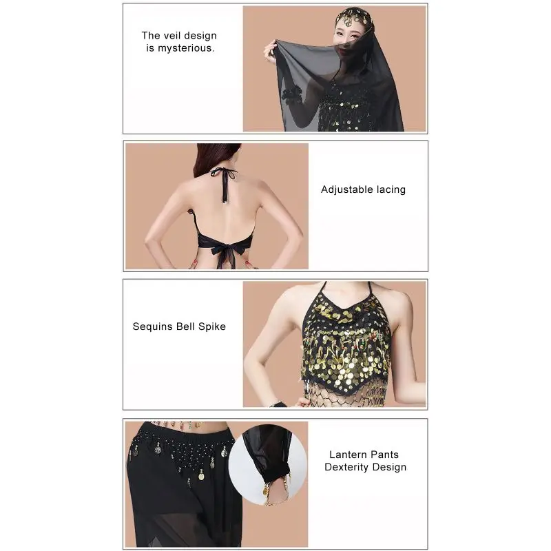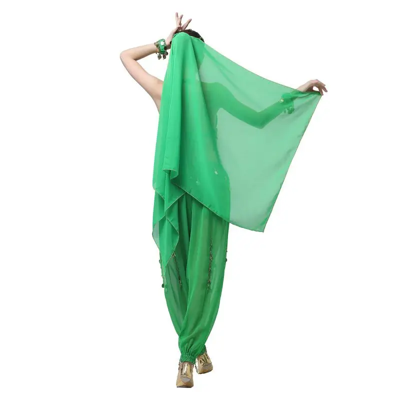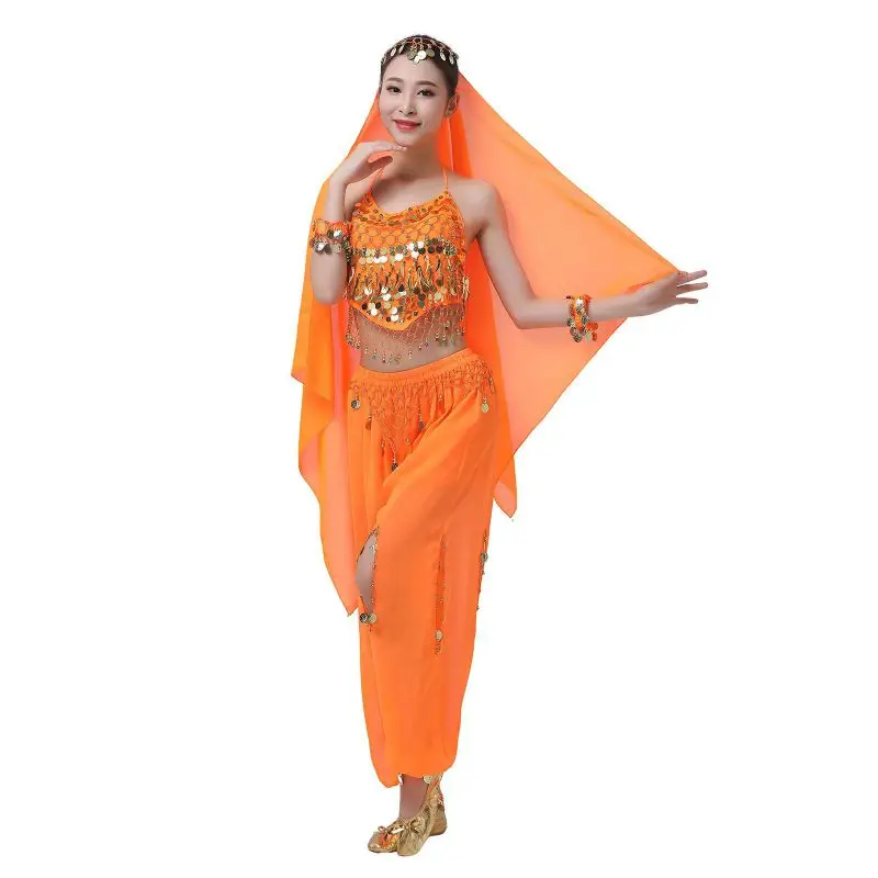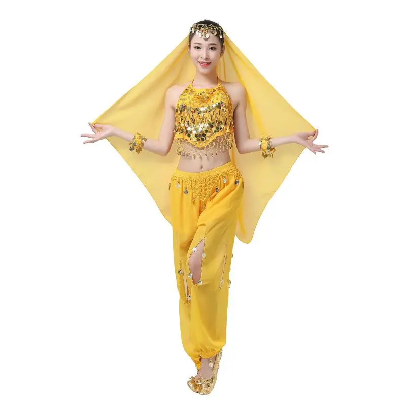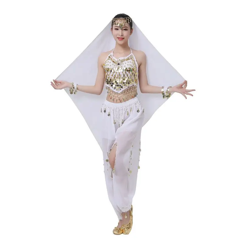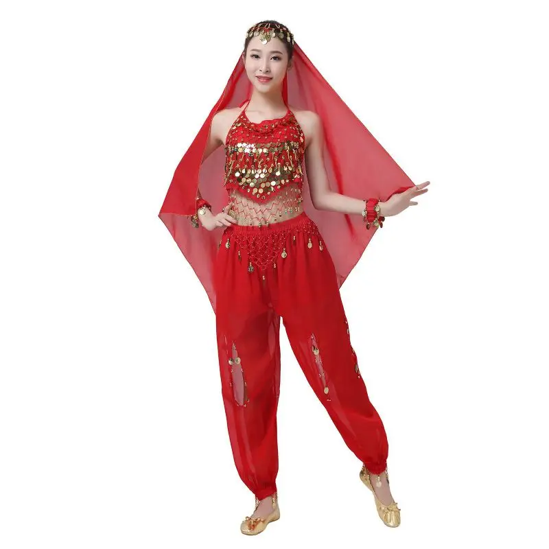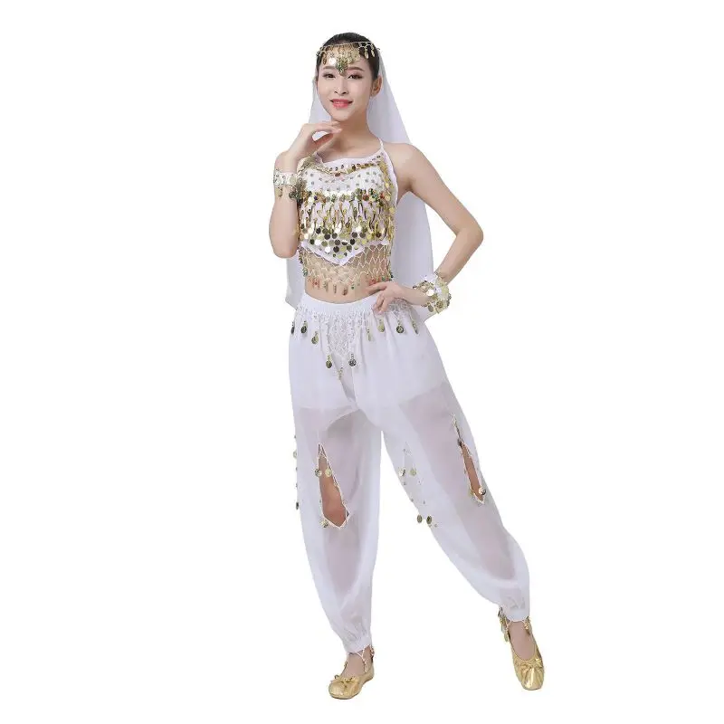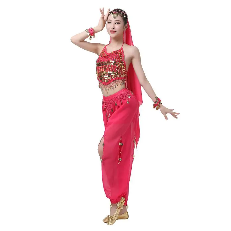 Un par de pantalones de danza del vientre para mujer o un par de top de danza del vientre para mujer + pantalones + pañuelo colgante para monedas + pulsera