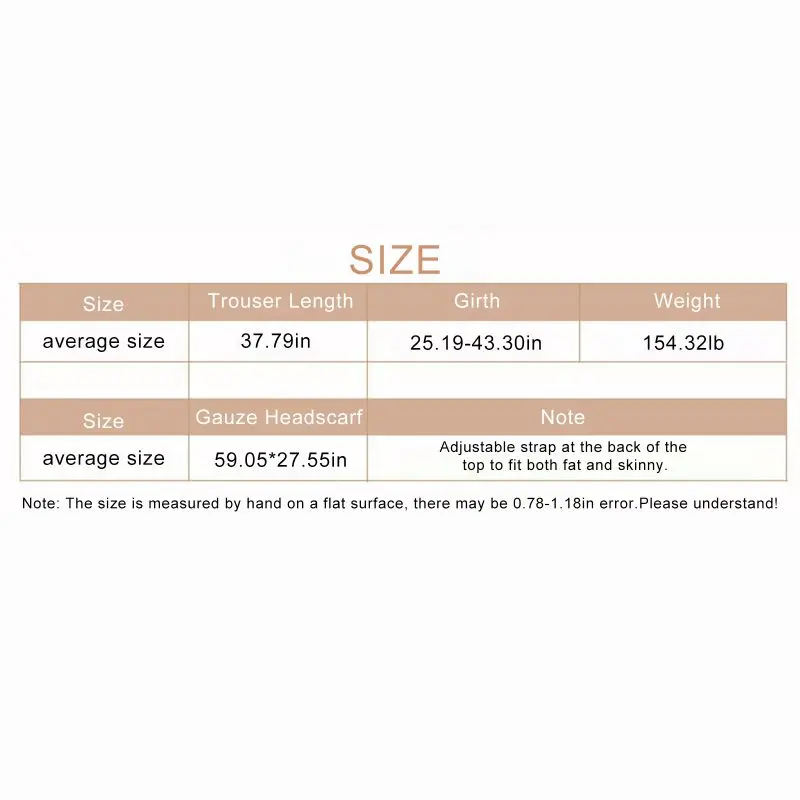 talla única---- aproximadamente 96 cm--- alrededor de 64-110 cm---- dentro de 70 kg--- 150*70 cm----- la correa trasera de la chaqueta puede tener el tamaño del cielo, gordo y delgado.Nota: El tamaño se mide mediante mosaico manual y puede haber un error de 2-3 cm.