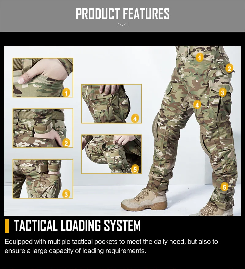 2. Cierre de gancho y bucle ajustable en la parte inferior y las rodillas de los pantalones.