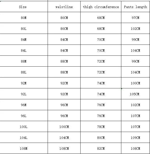 Sobre el tamaño: En términos generales, el número delante de la cintura es cuántos centímetros. Las letras en la parte posterior son la diferencia en la longitud del pantalón. Por ejemplo, 88M y 88L, su tamaño de cintura es de 88CM, ¡la diferencia está solo en la longitud del pantalón!