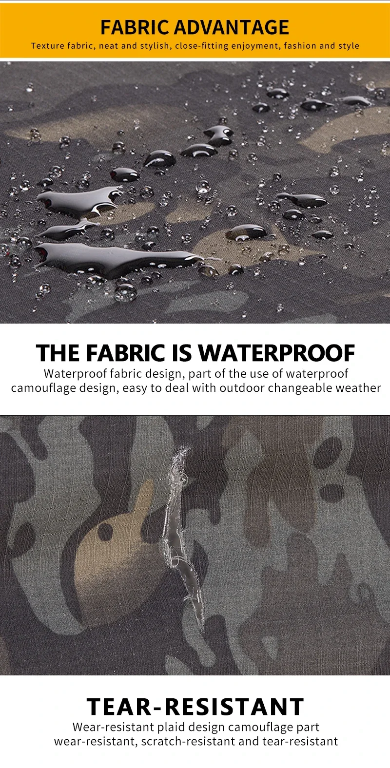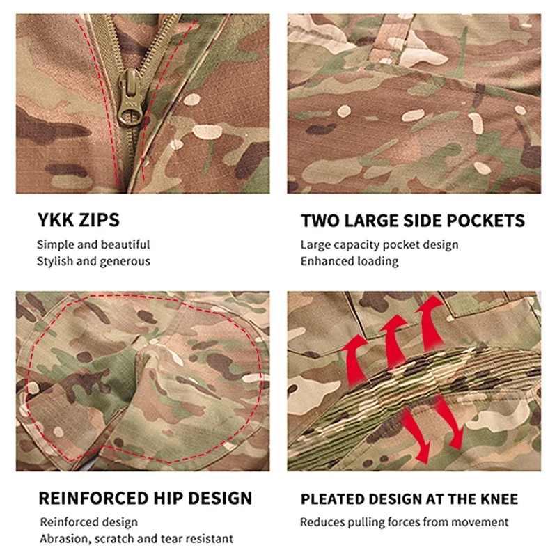 Característica: 1. El Bolsillo pequeño izquierdo puede contener encendedor y herramientas EDC, etc. 2. Diseño multibolsillo con bolsillo de gran capacidad para exteriores 3. Posición de la rodilla de corte 3D 4. Cintura con banda de goma que puede ajustar el rango. 5. El lazo lateral del pantalón puede suspender objetos pequeños 6. Cremallera YKK 7. Diseño doblado en la cintura trasera y las rodillas para una alta elasticidad. 8. Rodillas/cintura/dobladillo ajustables con cordón o velcro
