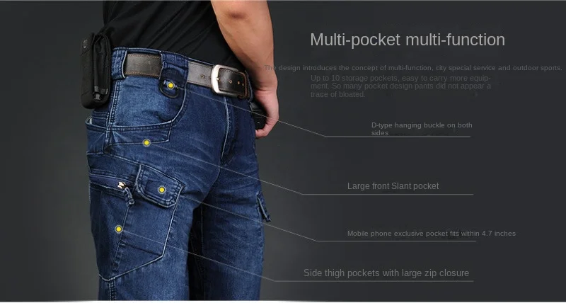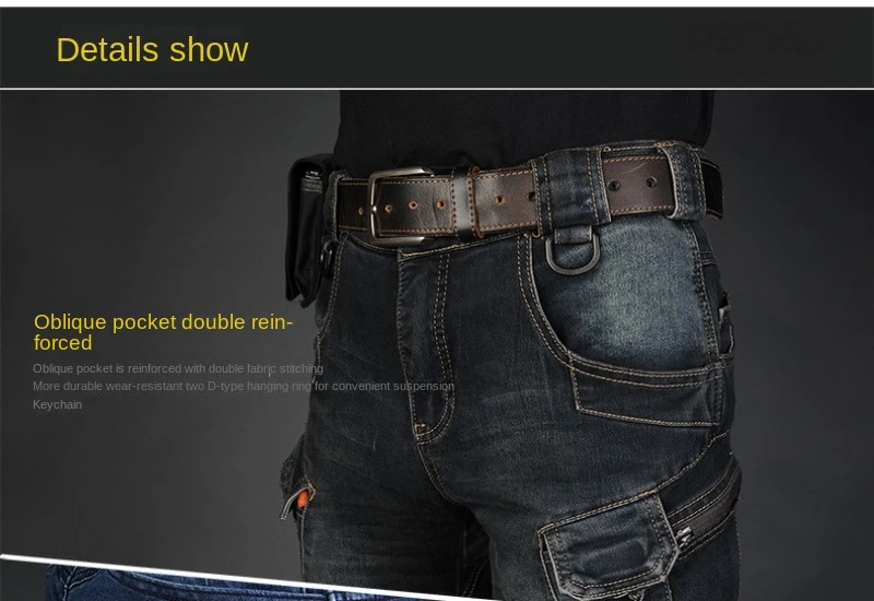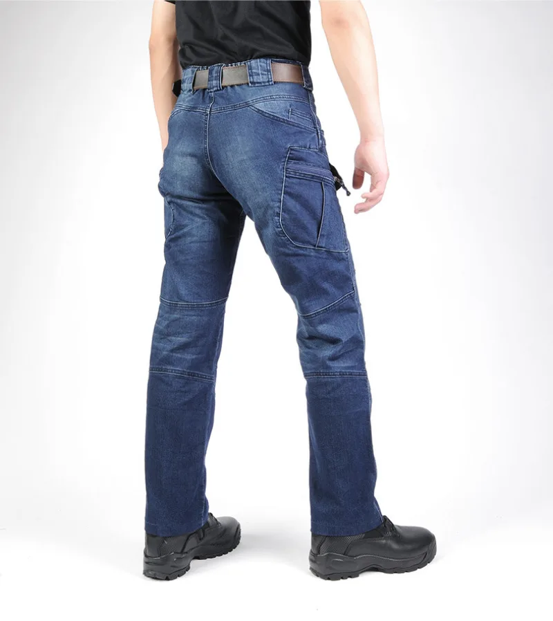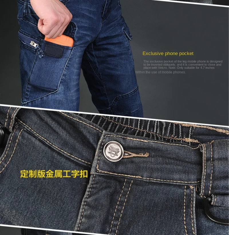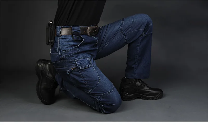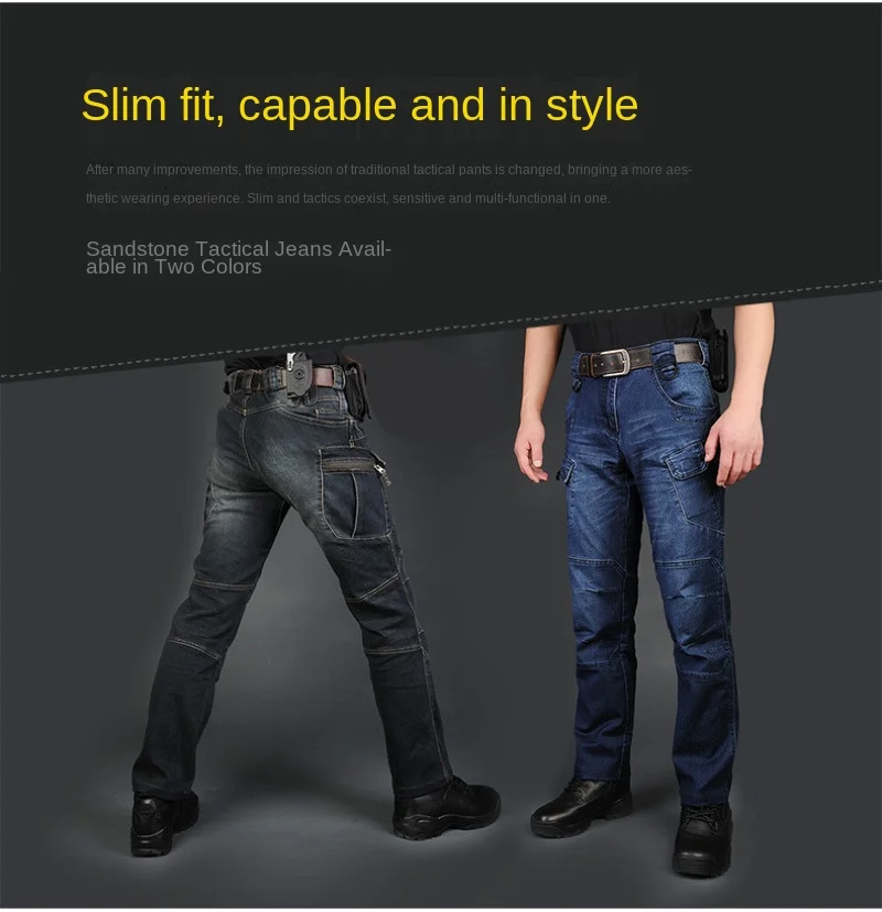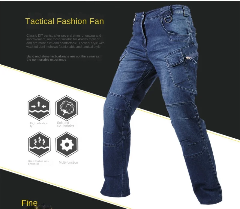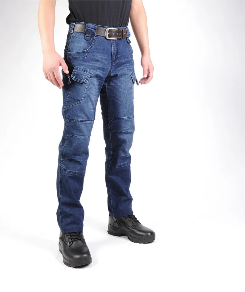 Pantalones vaqueros rectos para hombre, pantalones elásticos ajustados, resistentes al desgaste, múltiples bolsillos, entrenamiento táctico para senderismo al aire libre, color azul
